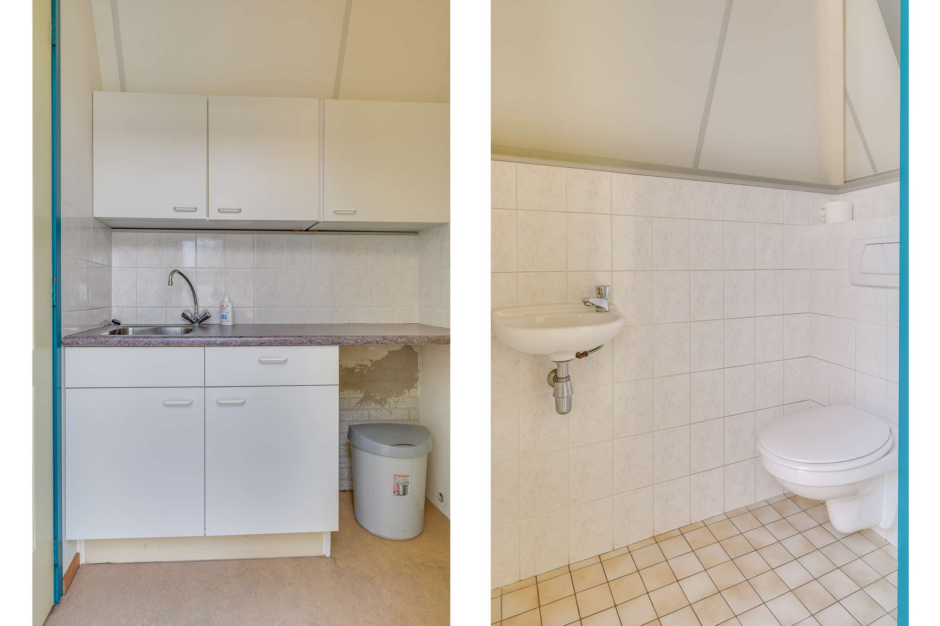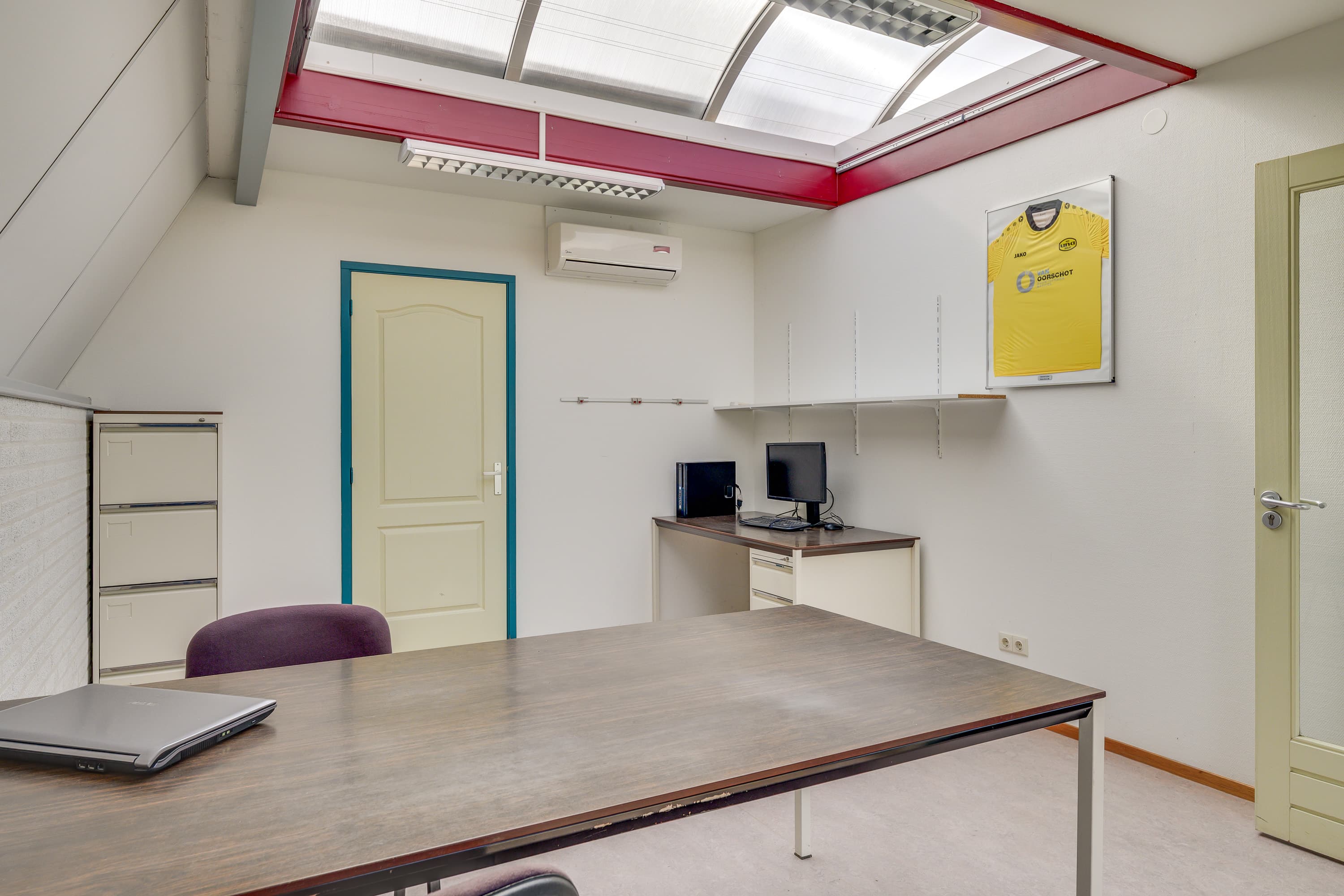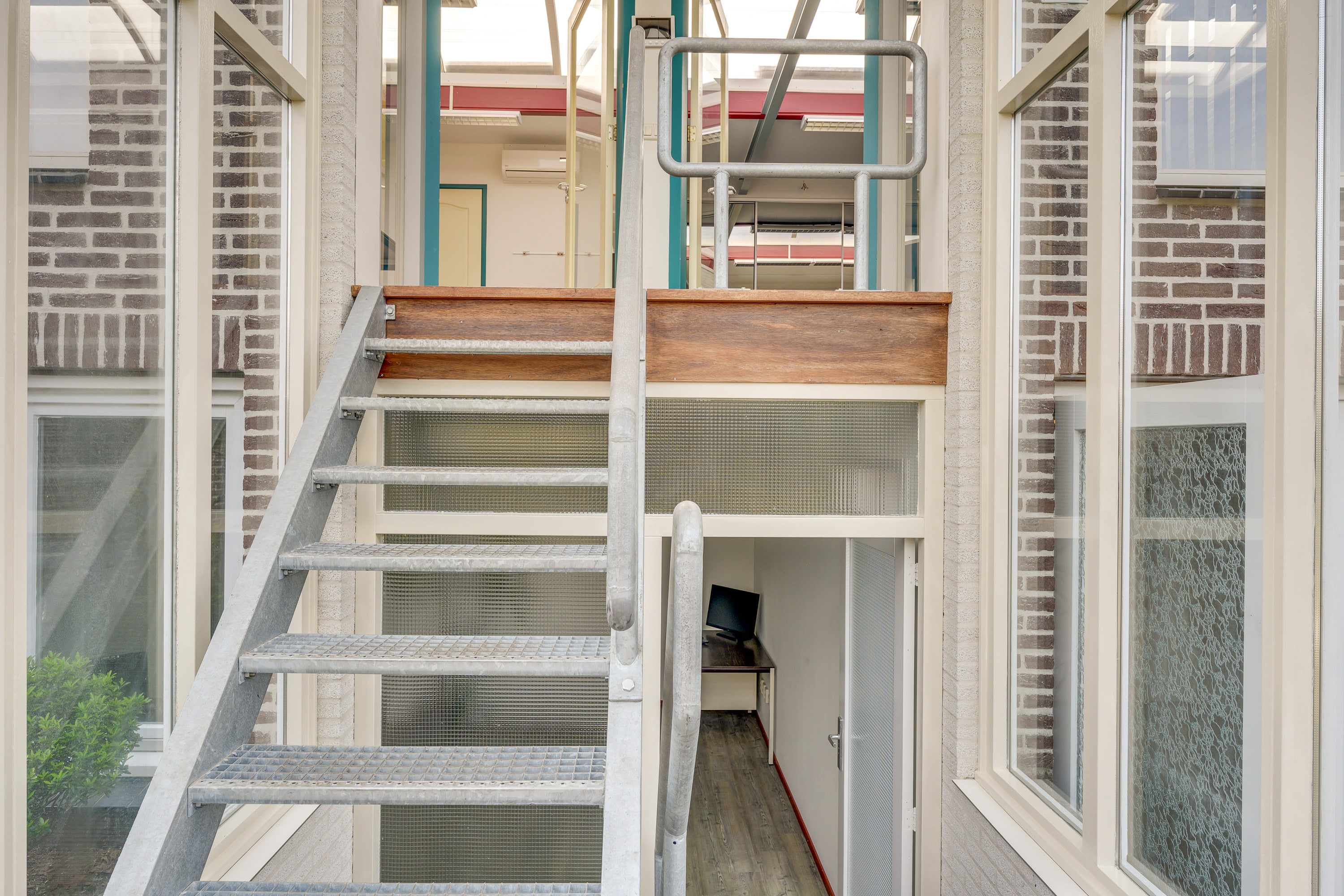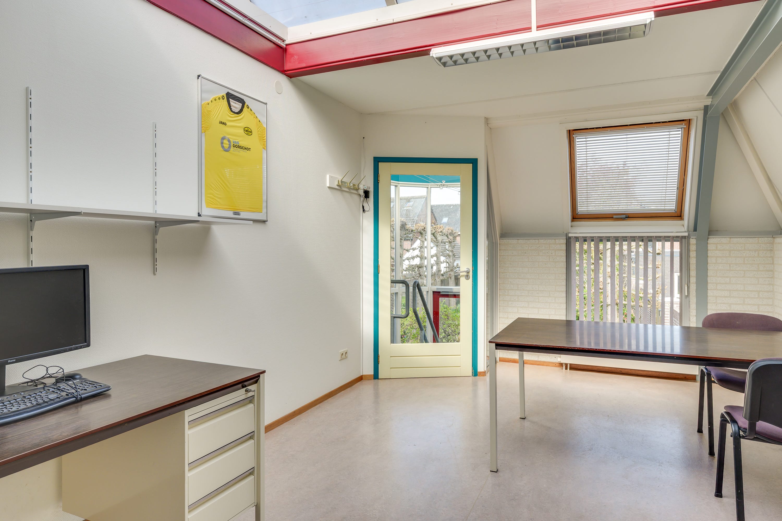 Op de begane grond bevindt zich links een kantoorruimte met plafondverwarming en een PVC-vloer. Rechts ligt een ruime garage in L-vorm of berging met vaste kastenwand over de volle lengte en driedubbele openslaande deuren naar de tuin. De verdieping beschikt over twee volwaardige kantoorruimtes met vloerverwarming en airco. De rechterruimte heeft een lichtkoepel over de volle breedte met zonwering, Velux dakramen en een luchtreinigingsunit met WTW. De tweede ruimte heeft eveneens een lichtkoepel en airco en sluit aan op een pantry met gootsteen. Daarnaast zijn er een aparte voorraadruimte met CV-ketel uit 2023 en een eigen toilet aanwezig. Het bijgebouw functioneert daardoor vrijwel zelfstandig. Op het dak liggen 21 zonnepanelen, geplaatst in 2020.