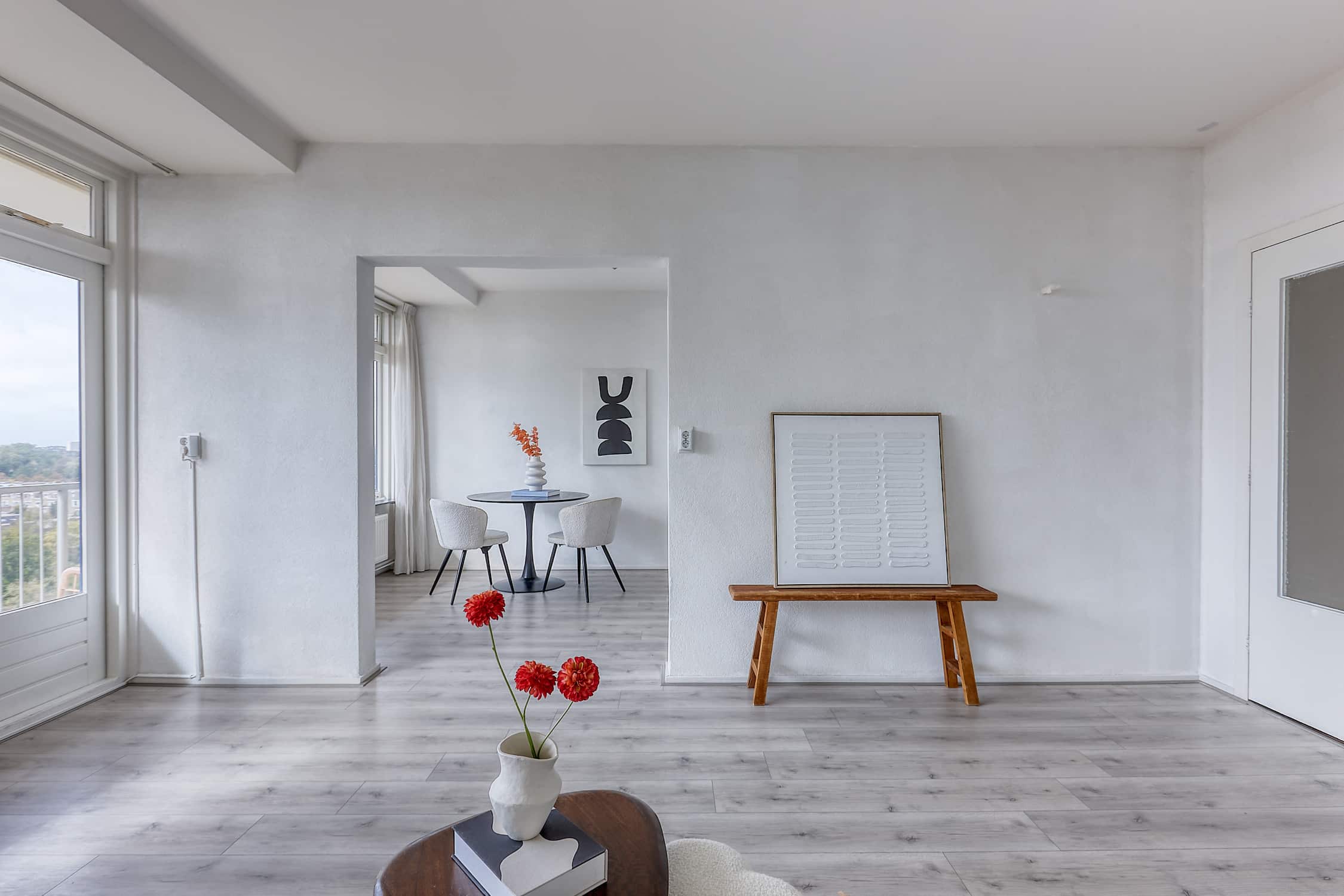 Binnenkomend stap je in de ruime hal met toegang tot alle vertrekken. De royale woonkamer is licht en uitnodigend, met een open verbinding naar het woningbrede balkon op het zuidwesten – dé plek om te ontspannen en te genieten van de middag- en avondzon.