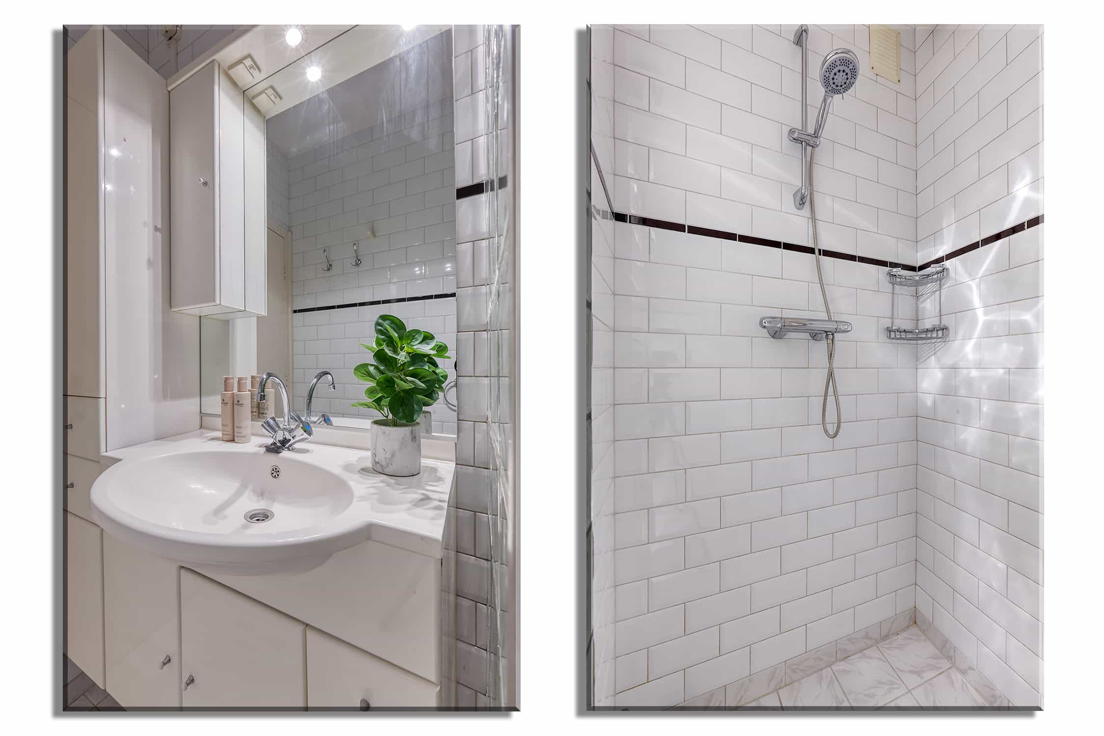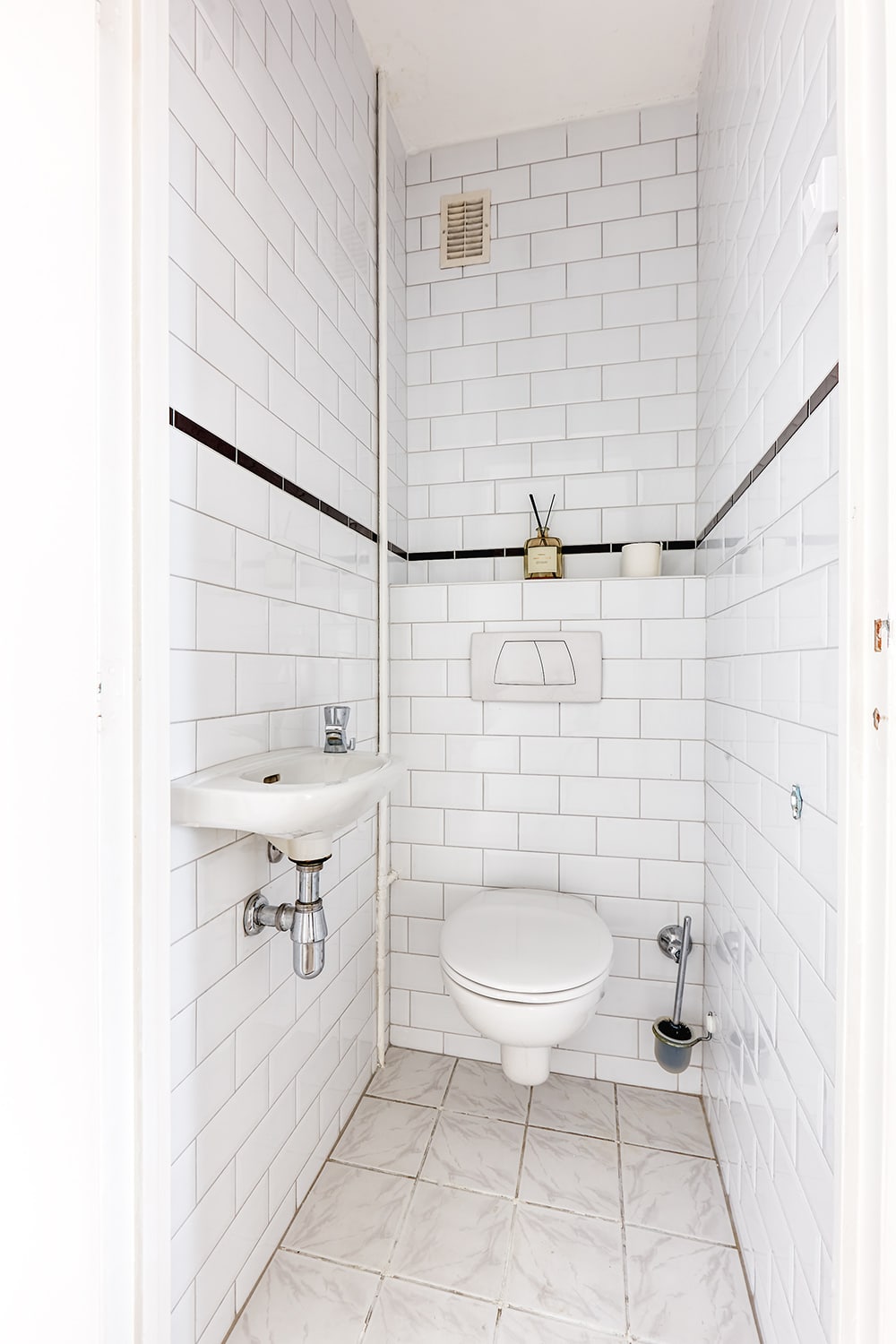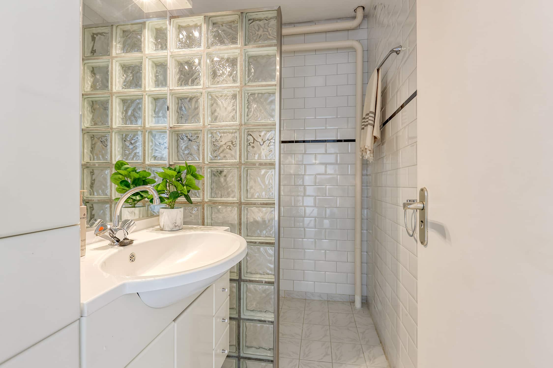 De badkamer is praktisch ingedeeld met douche en wastafelmeubel, en er is een separaat toilet aanwezig.