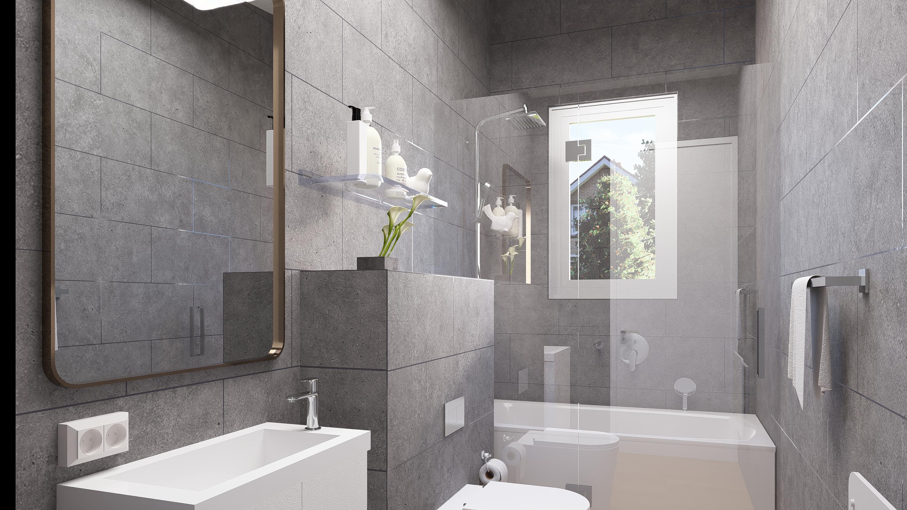 Slimme indeling: Wasmachine- en drogeraansluitingen in de badkamer, die tevens is voorzien van een inloopdouche, wastafel met meubel, radiator en hangend toilet.