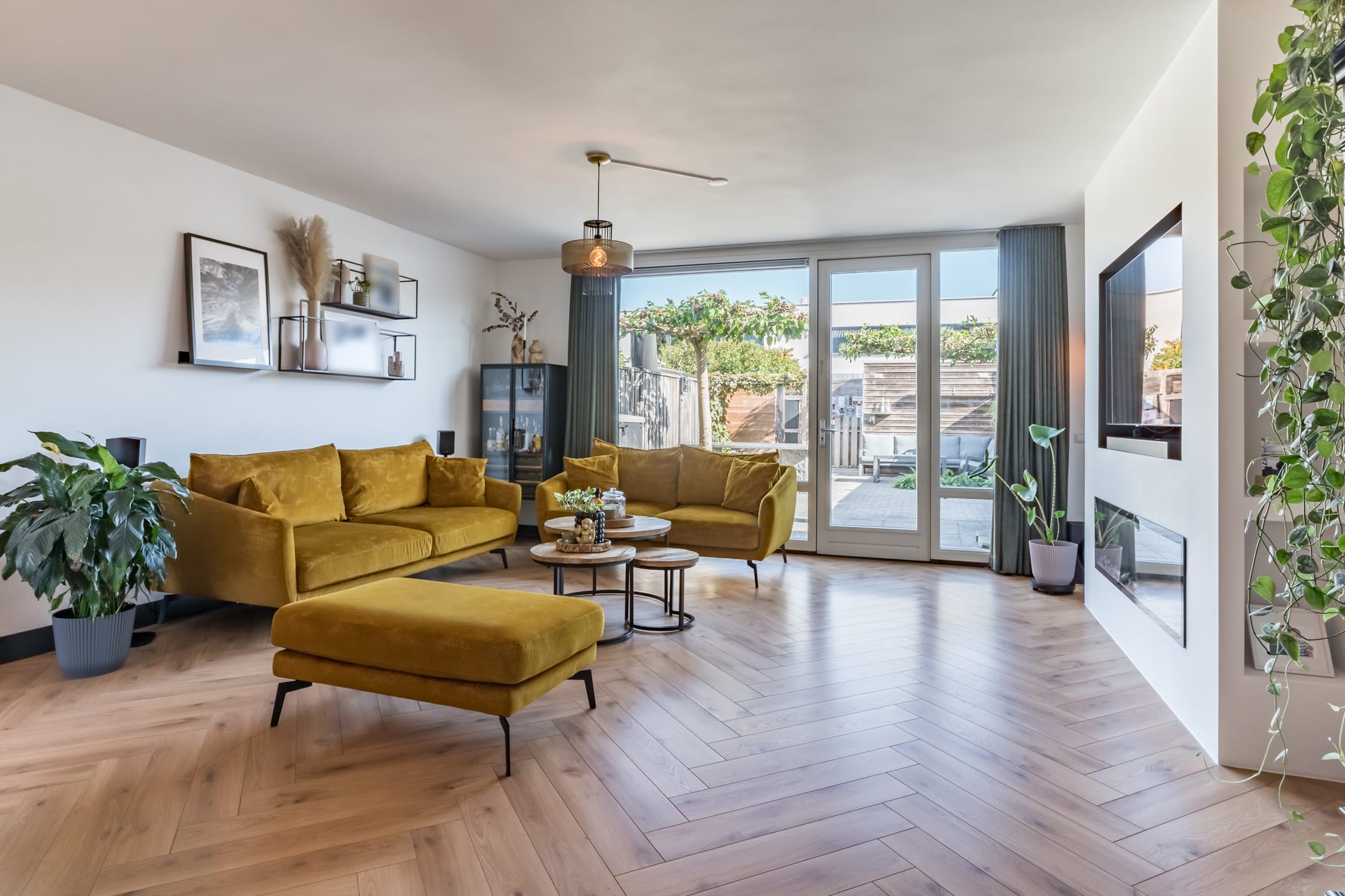 De uitgebouwde woonkamer is indrukwekkend royaal, bijna 12 meter diep! De visgraatvloer met vloerverwarming en strakke wanden en plafond geven de ruimte een moderne uitstraling. Grote raampartijen en openslaande tuindeur zorgen voor een zee van licht en verbinden binnen met buiten. Onder de trap vind je bovendien een praktische kastruimte.