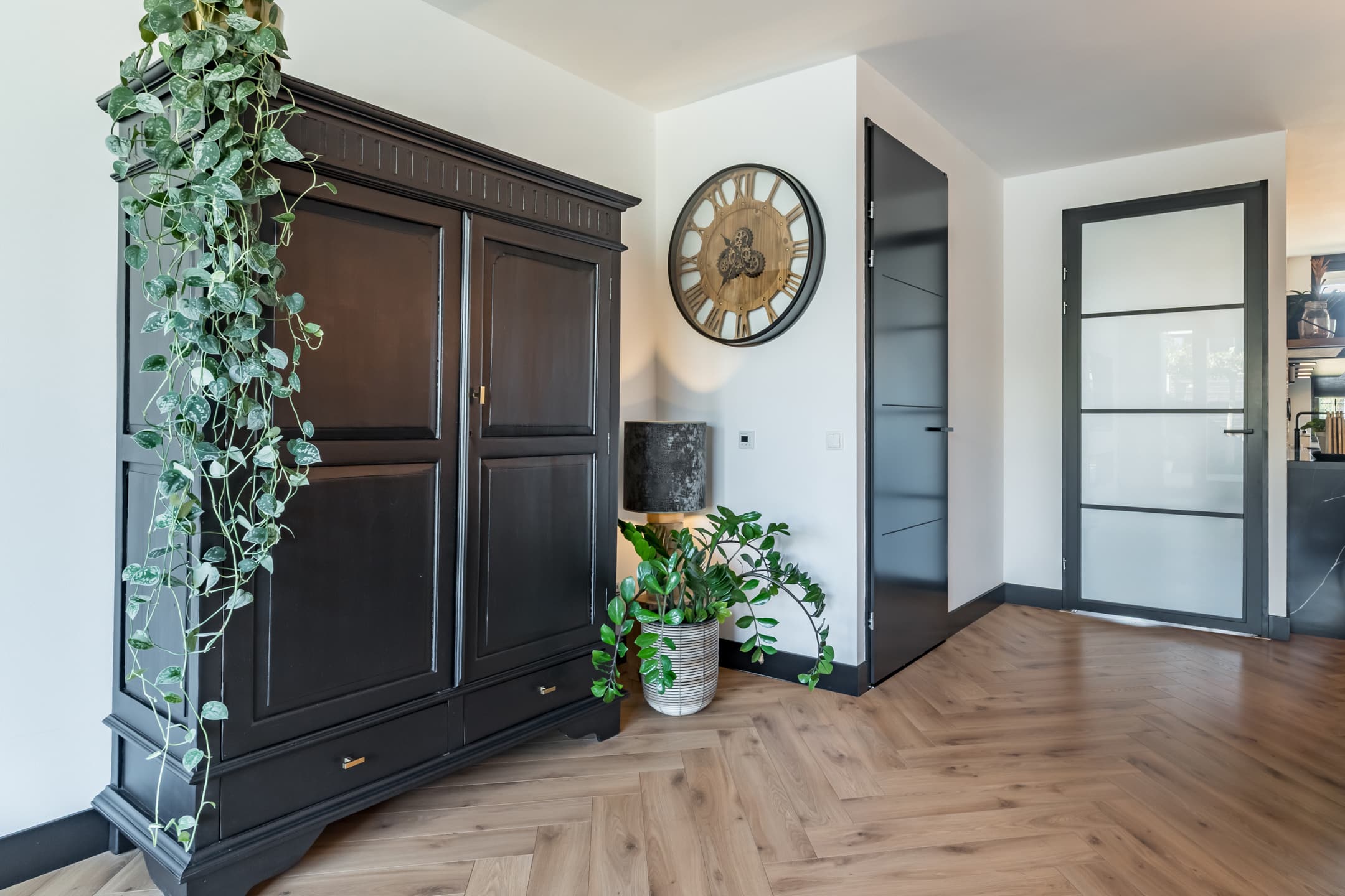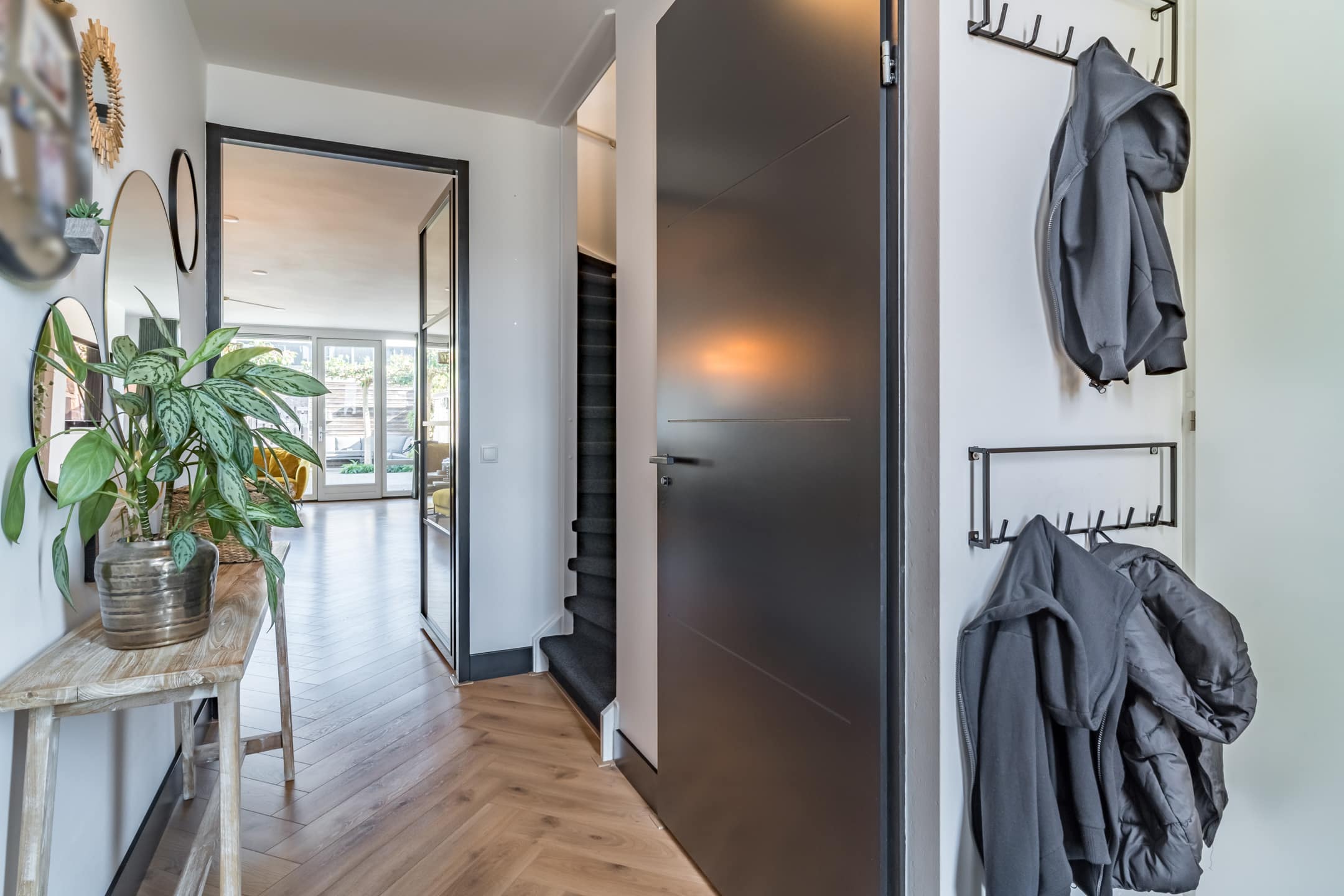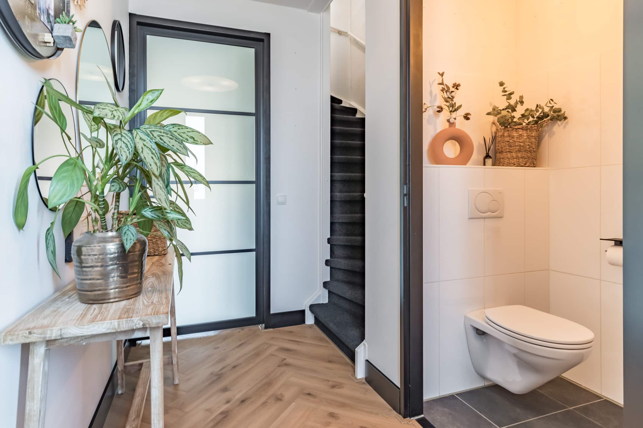 Bij binnenkomst in de ruime hal voel je meteen de warme sfeer van dit huis. De fraaie zwarte tussendeur geeft een stijlvolle entree naar de woonkamer. Vanuit de hal heb je toegang tot het toilet, de meterkast en de trapopgang.