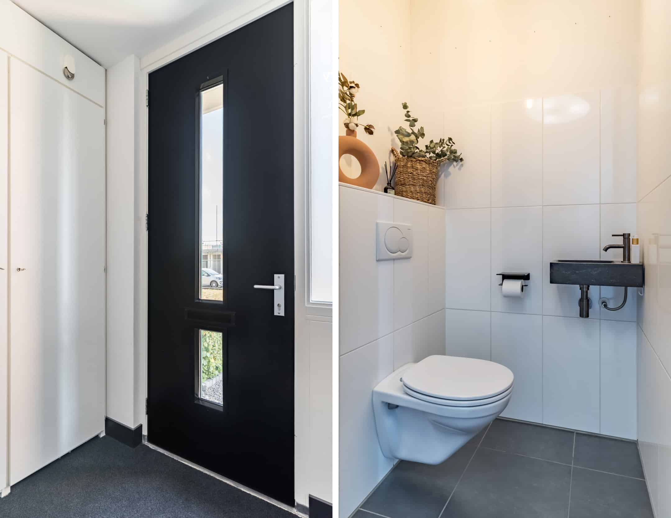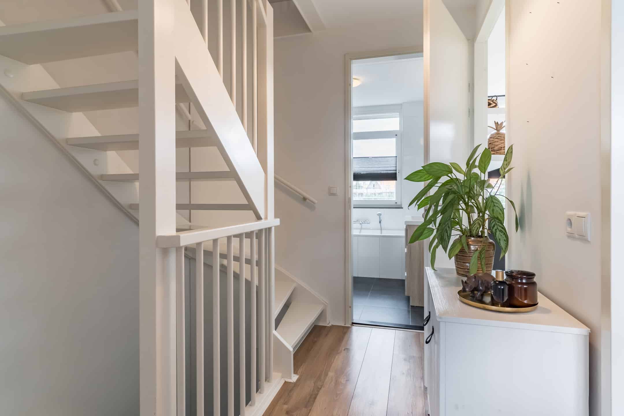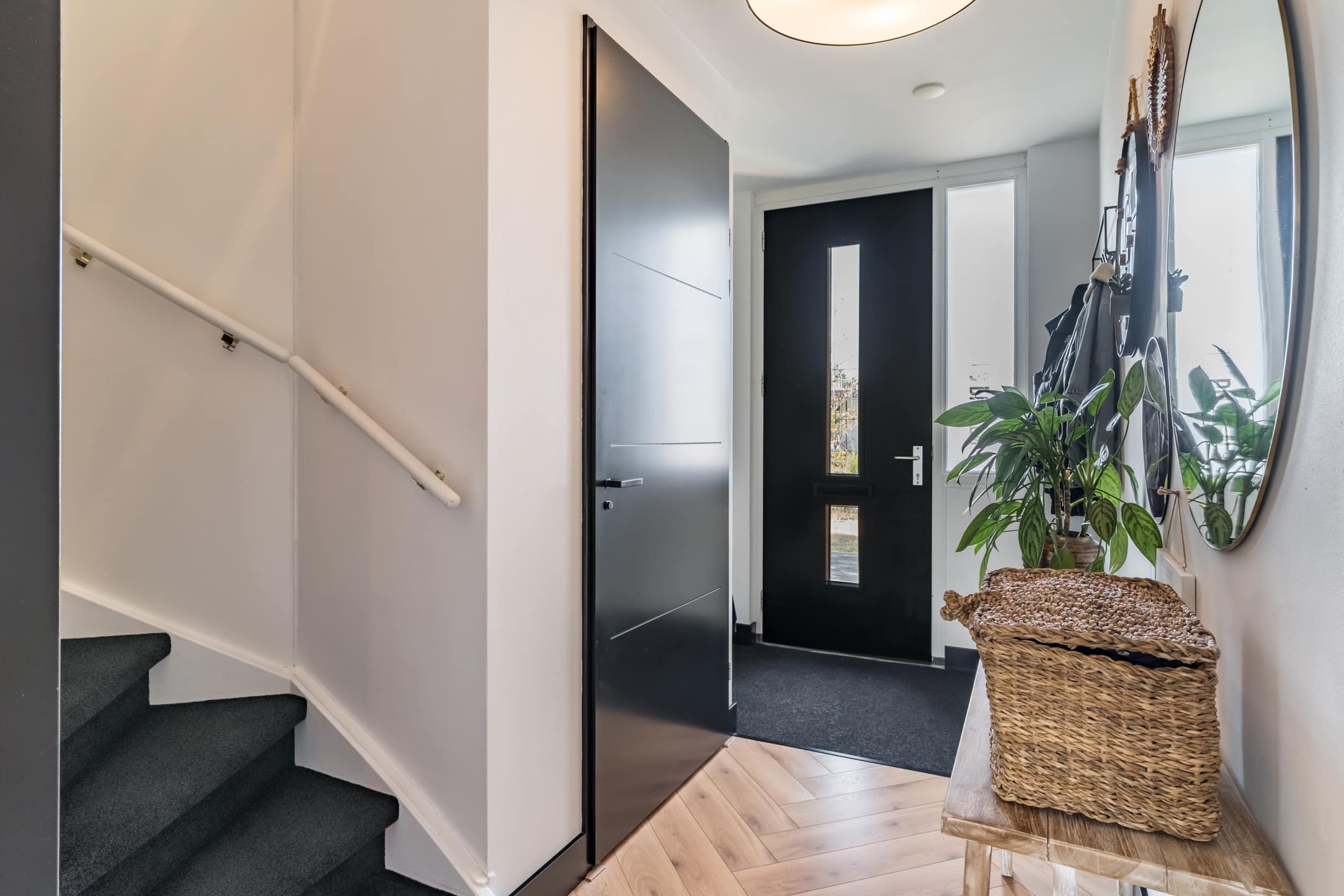 Bij binnenkomst in de ruime hal voel je meteen de warme sfeer van dit huis. De fraaie zwarte tussendeur geeft een stijlvolle entree naar de woonkamer. Vanuit de hal heb je toegang tot het toilet, de meterkast en de trapopgang.