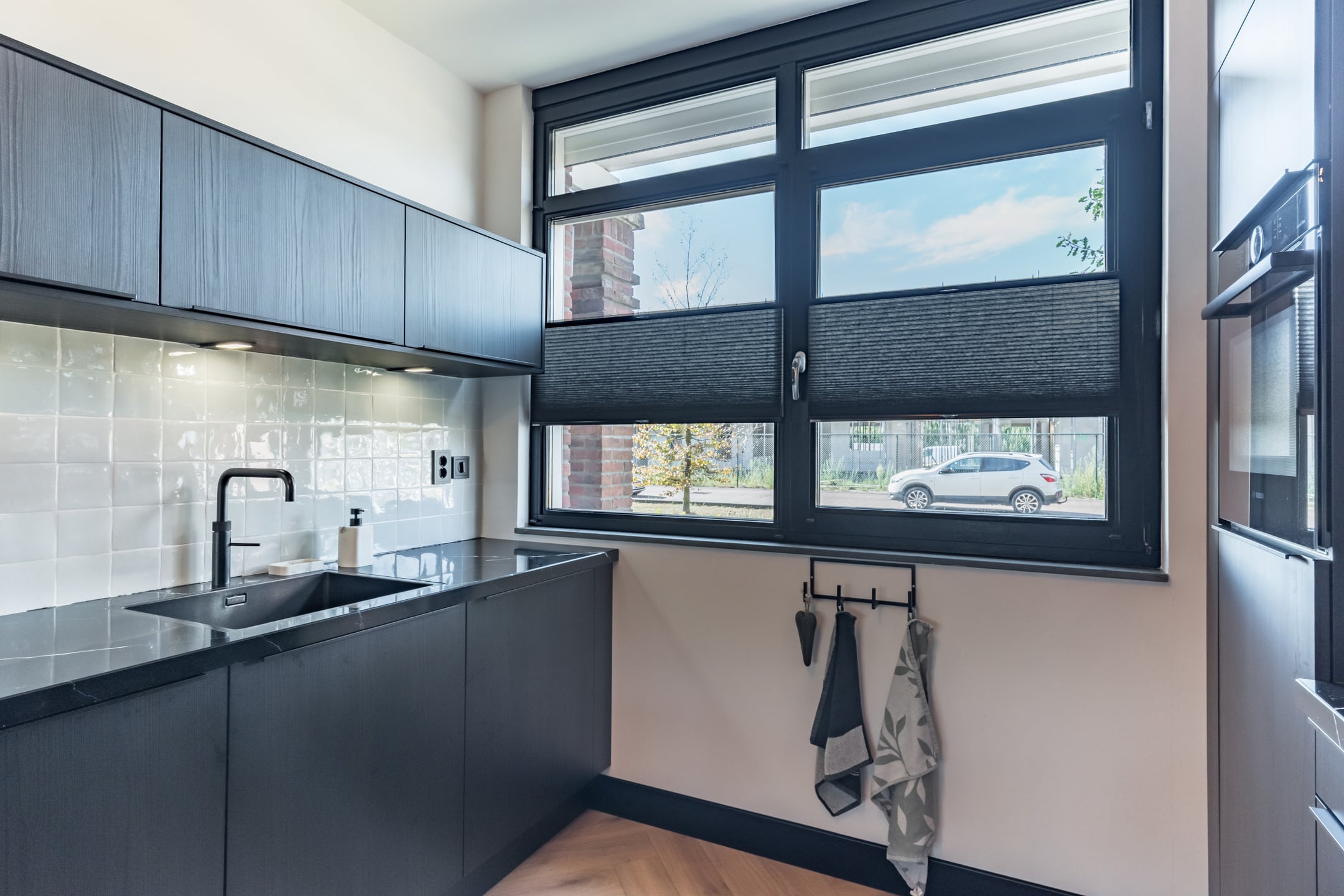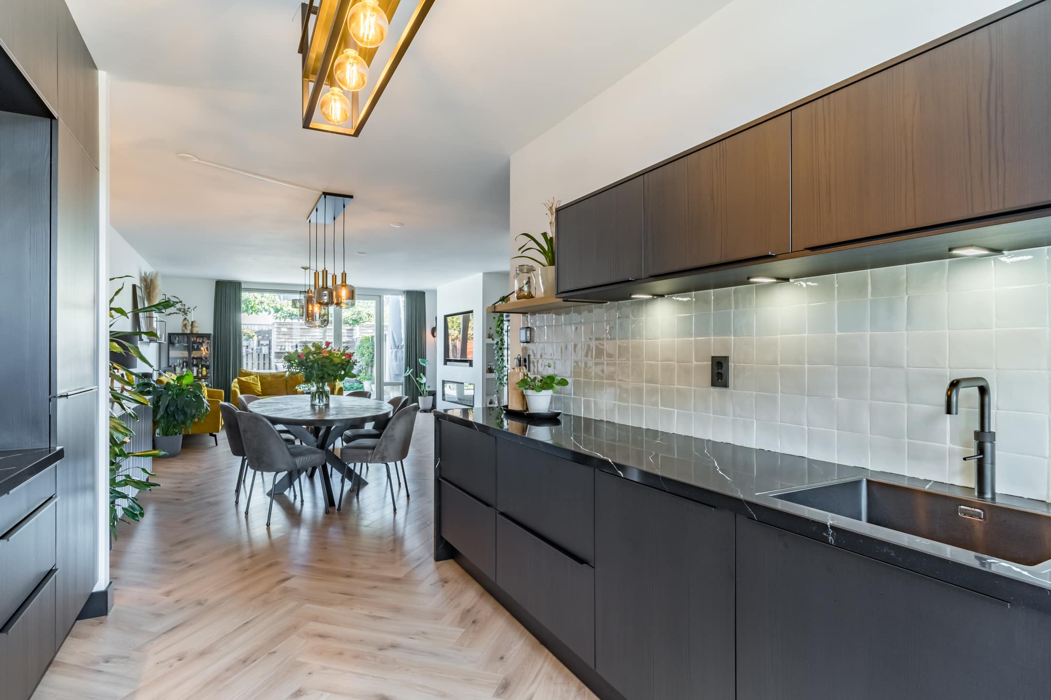 De strakke zwarte keuken aan de voorzijde is een waar kookparadijs. Voorzien van hoogwaardige inbouwapparatuur zoals een 5-pits inductiekookplaat , Quooker, afzuigkap, extra hoge oven met magnetronfunctie, vaatwasser, koelkast en diepvries (alle inbouwapparatuur van A-merken) is het hier elke dag fijn koken. Het royale granieten werkblad en de vele kasten, voornamelijk lades, maken deze keuken zowel praktisch als stijlvol.