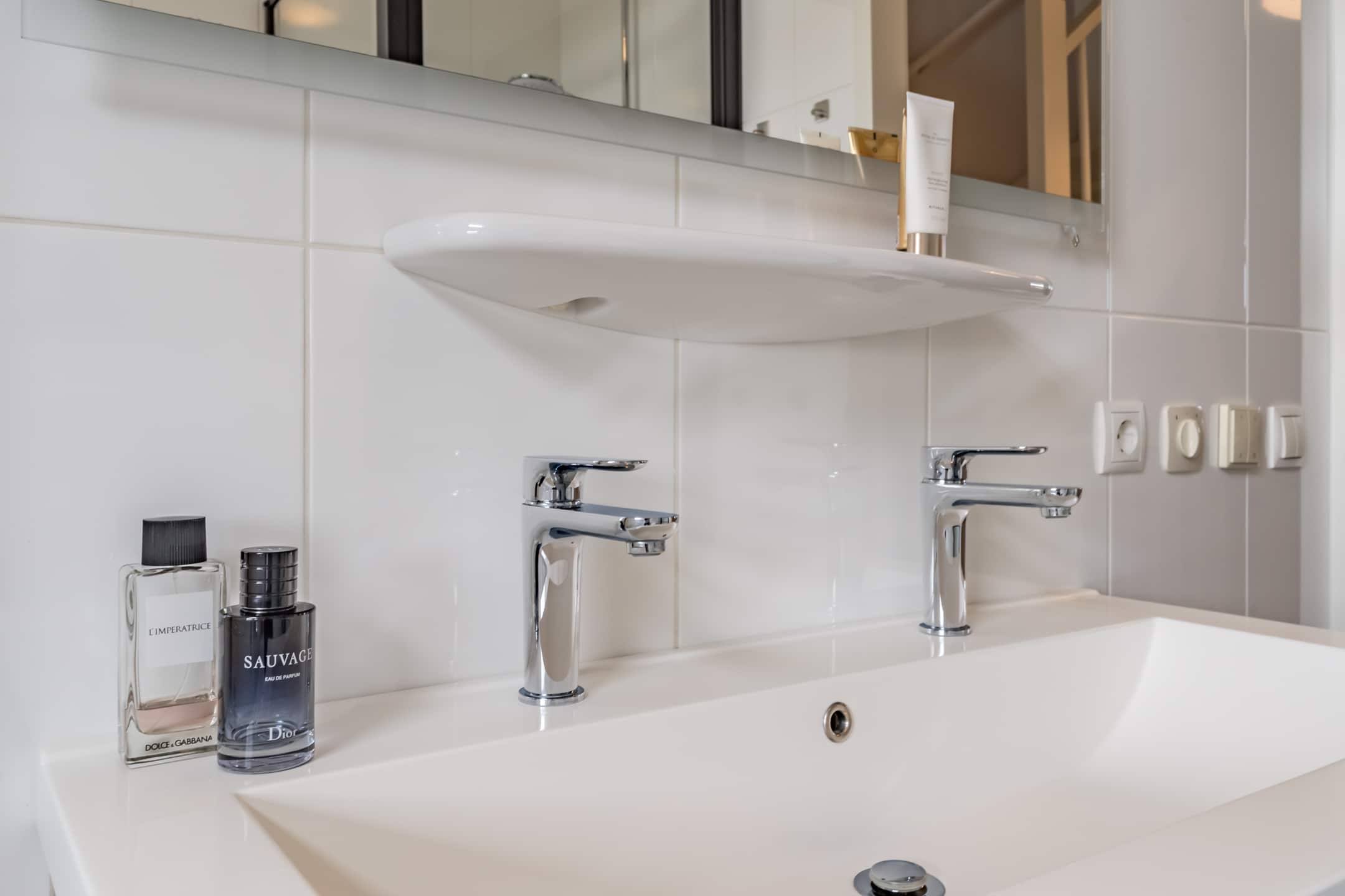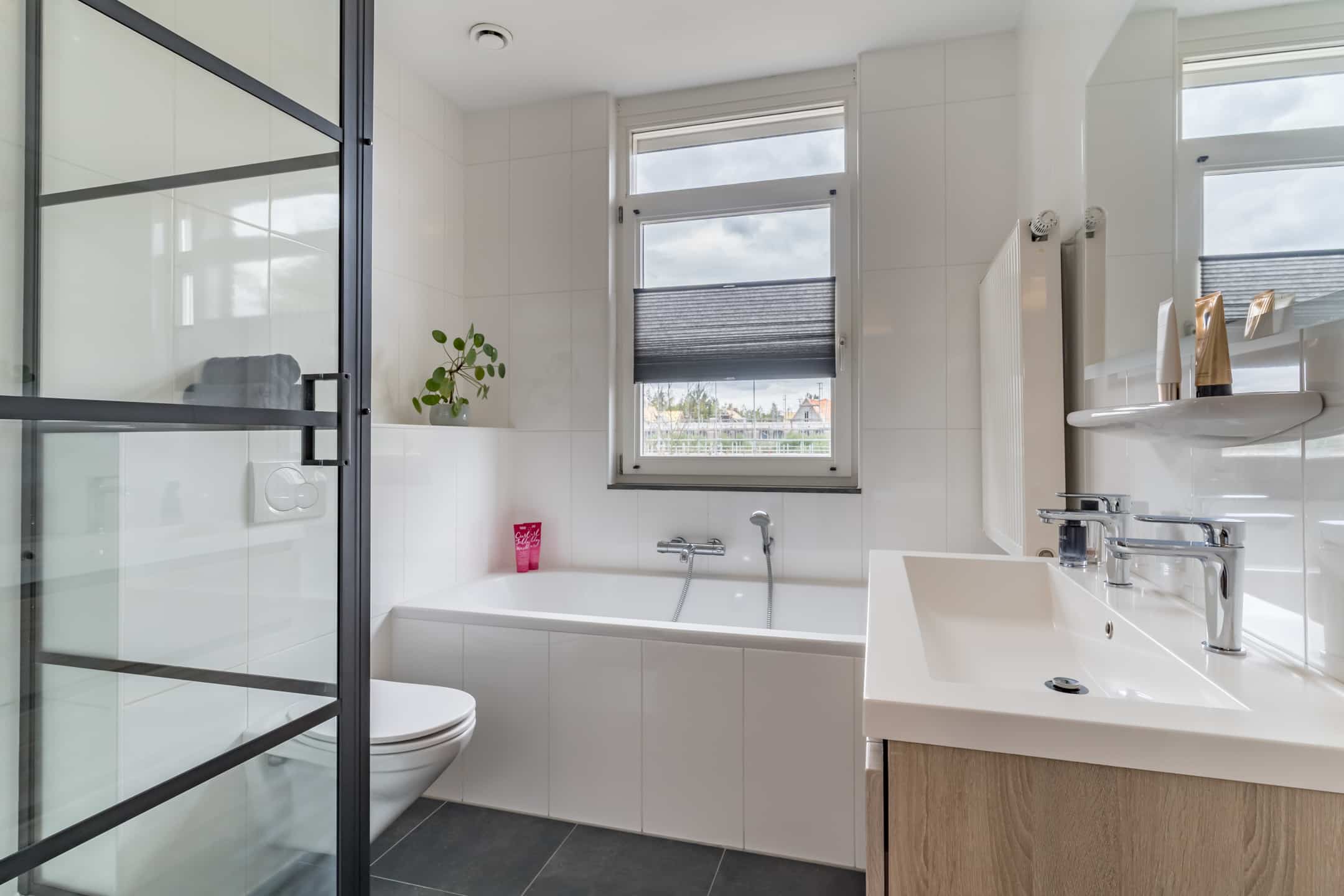 De lichte badkamer is ingericht met een ligbad, aparte douchecabine, wandcloset en een wastafelmeubel. Strakke lijnen en moderne materialen maken dit tot een heerlijke plek om te ontspannen.