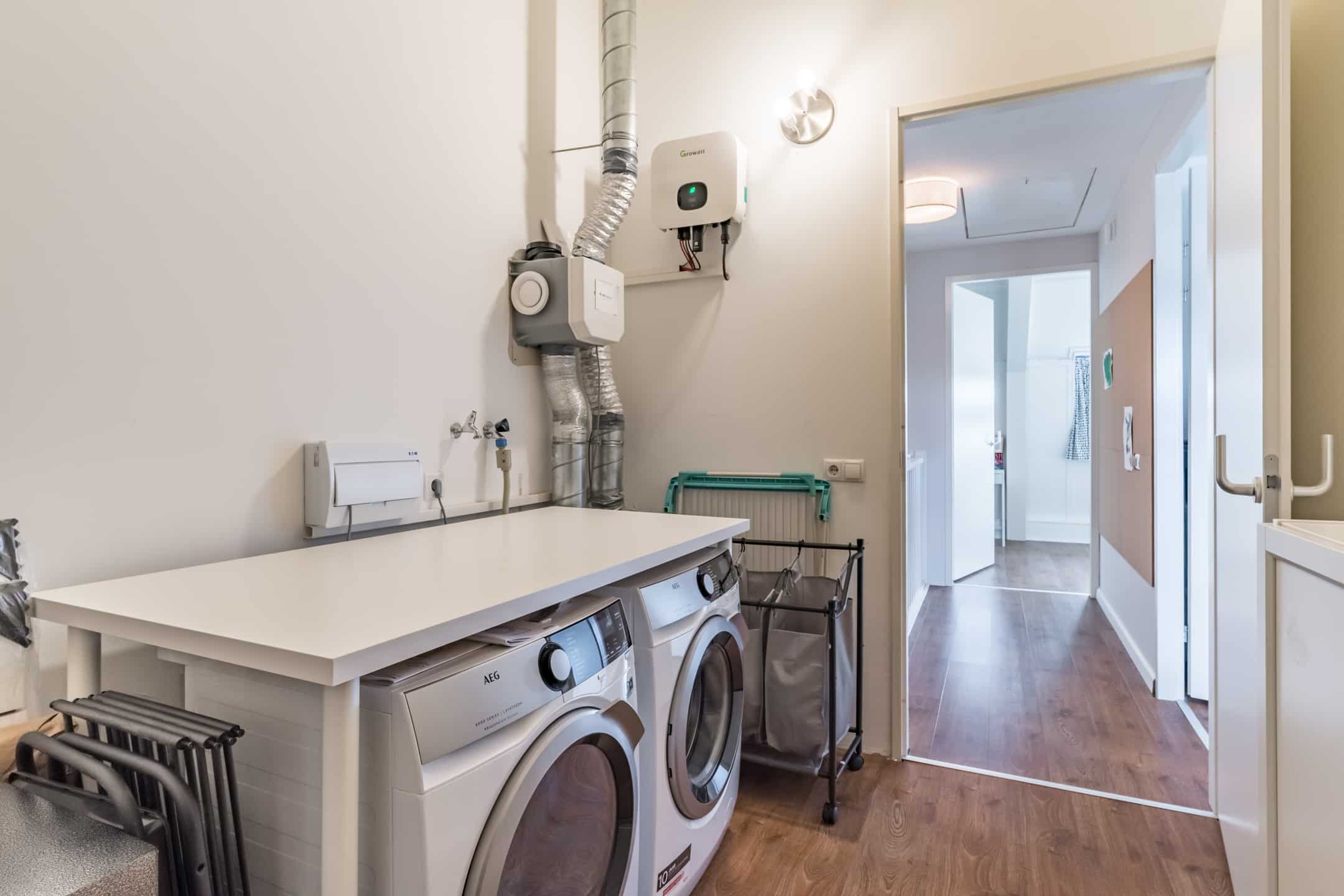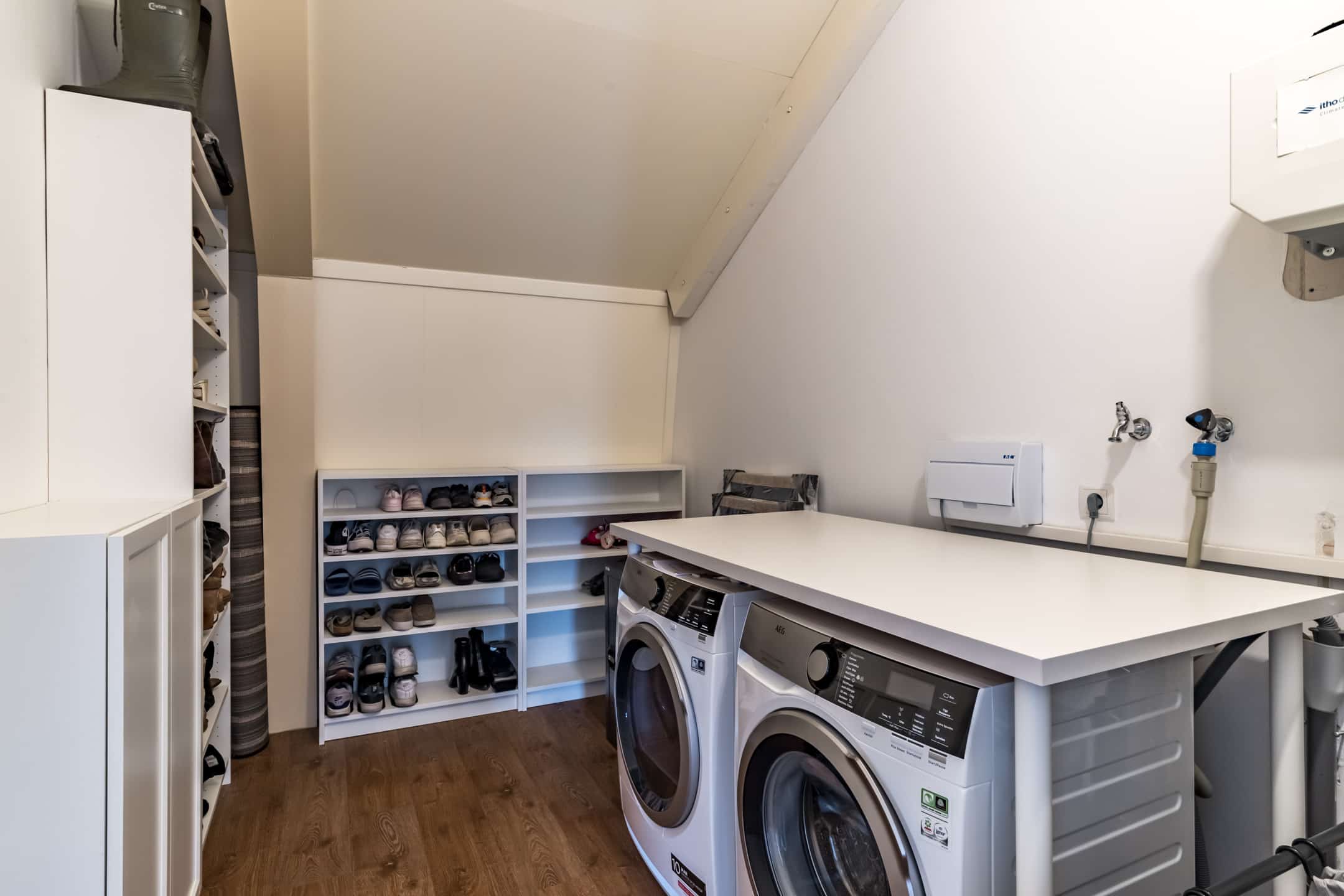 De aparte waskamer biedt volop ruimte voor wasapparatuur, extra opbergruimte en herbergt tevens de unit van de mechanische ventilatie. Handig en netjes weggewerkt.