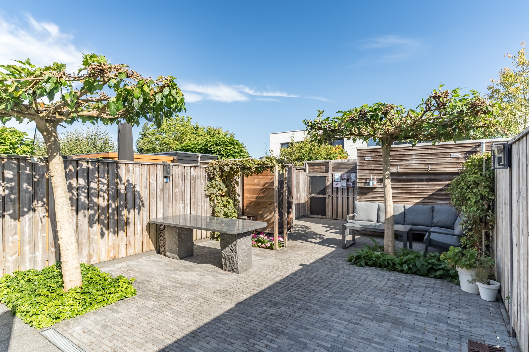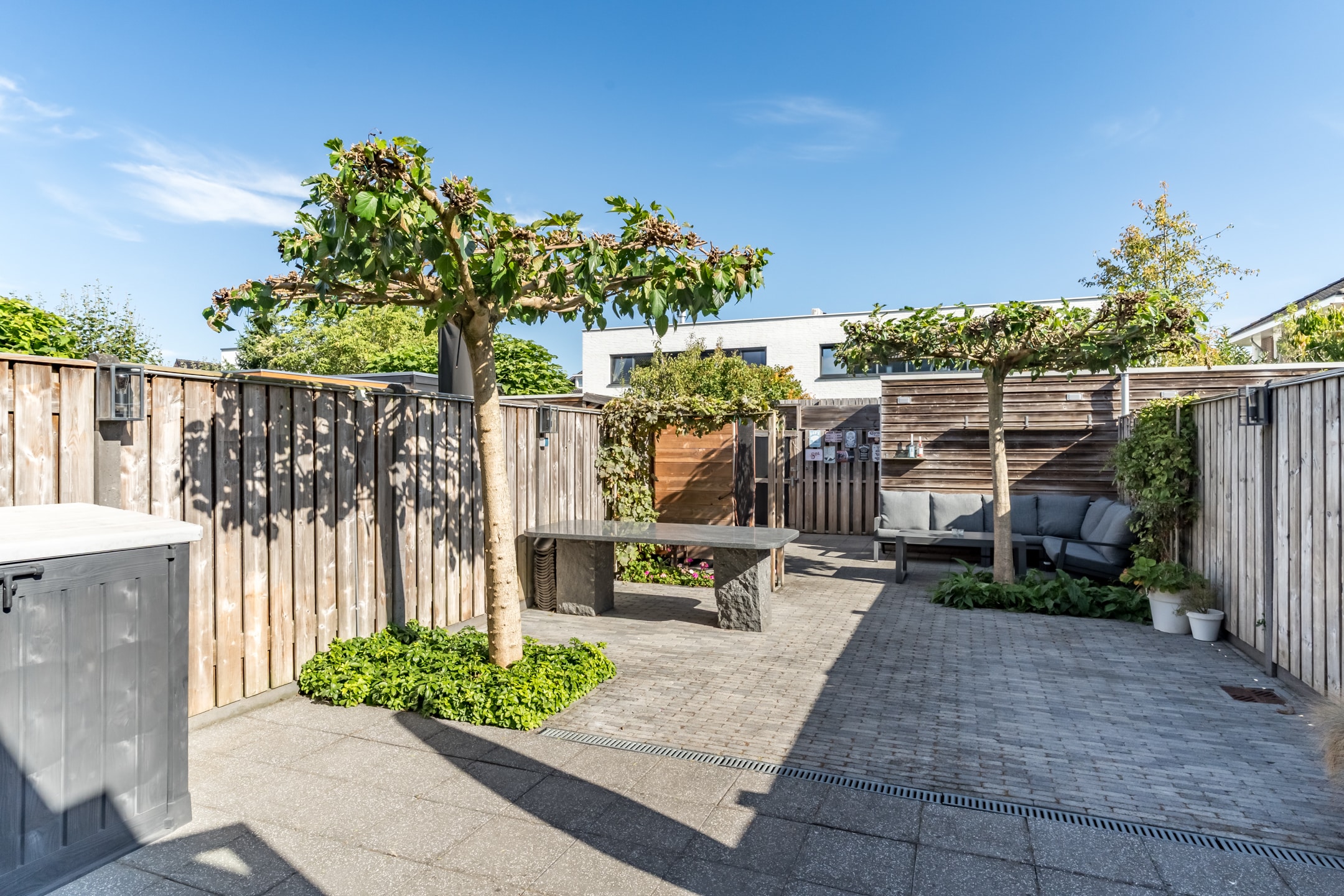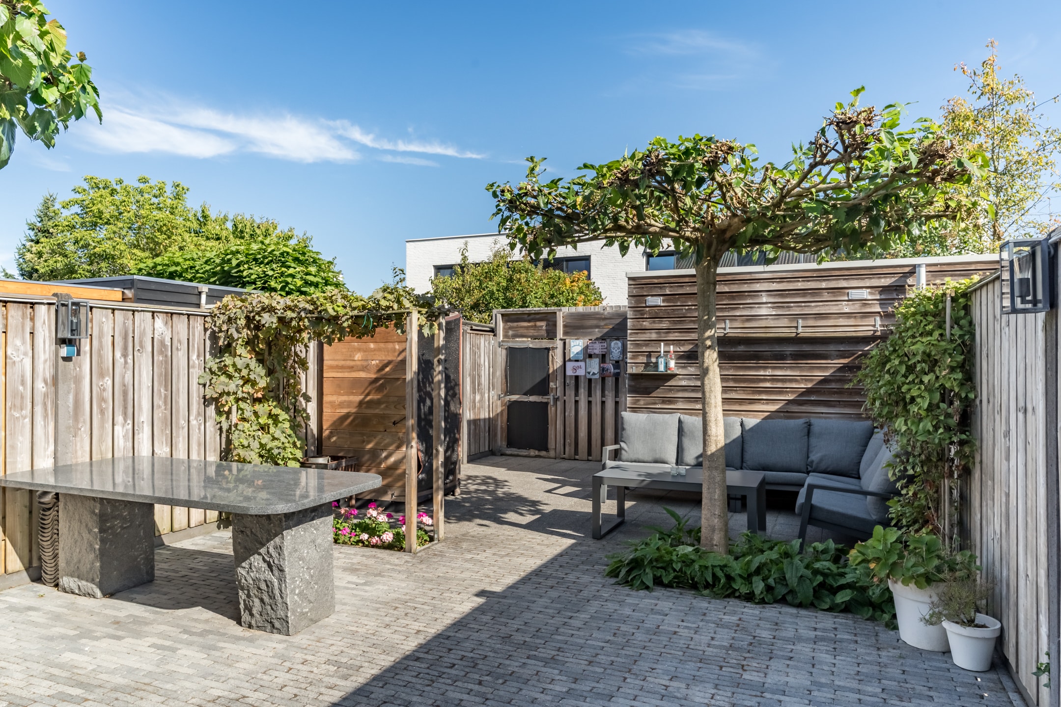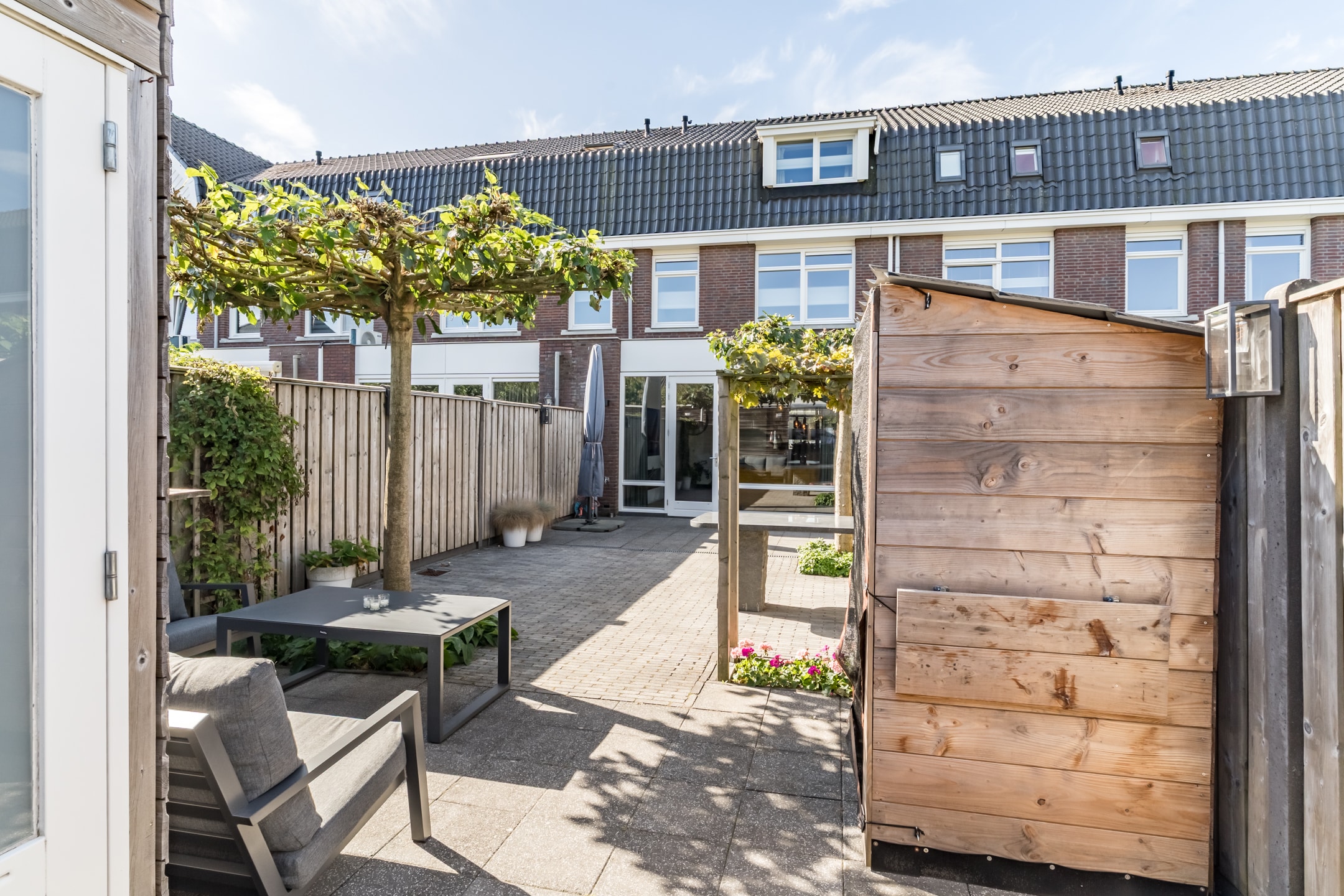 De zonnige, diepe achtertuin is een heerlijke plek voor jong en oud. Er is ruimte genoeg voor een loungeset en een grote eettafel en eventuele speeltoestellen. Helemaal achterin bevindt zich een houten berging met elektra en een achterom.