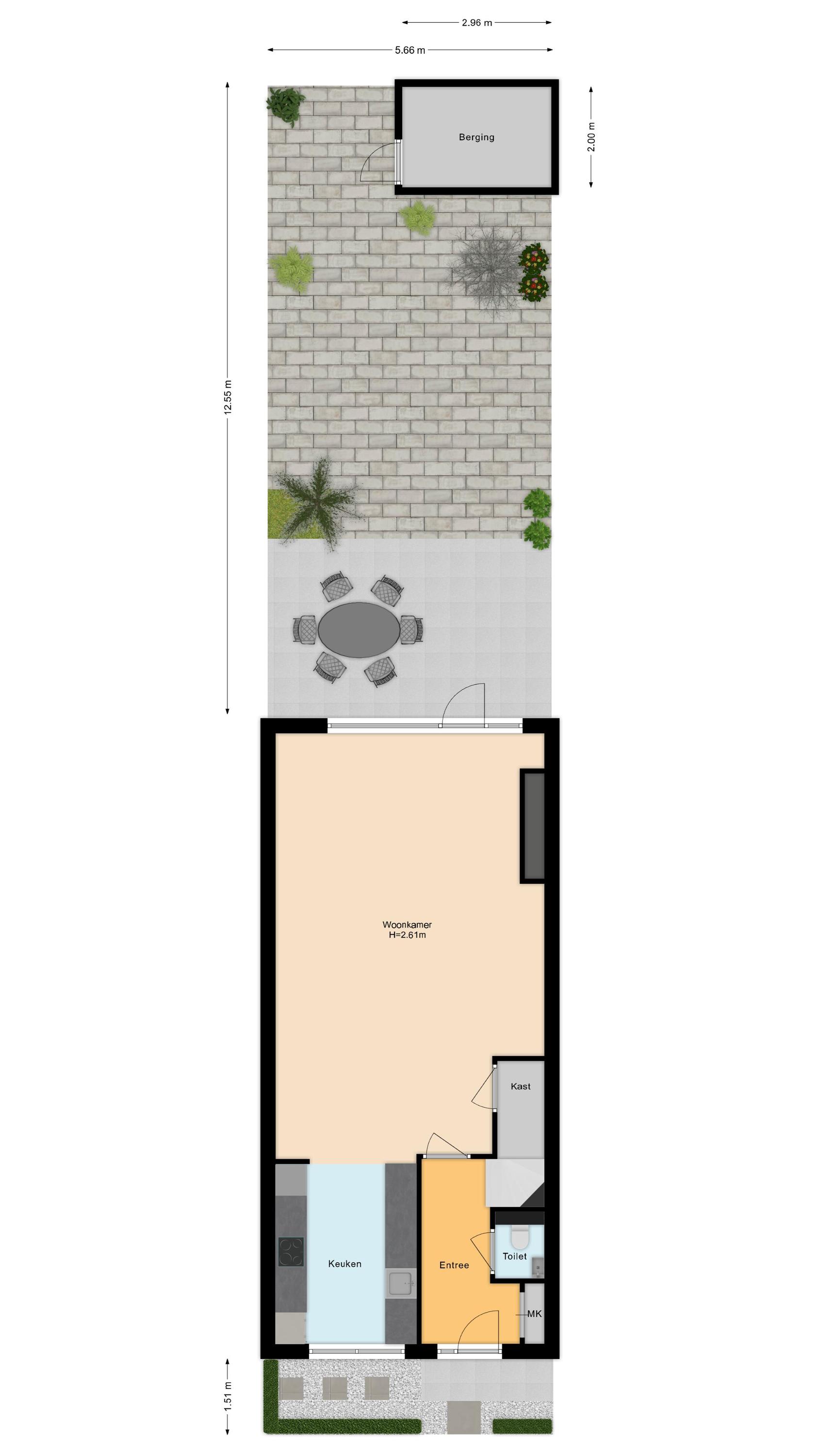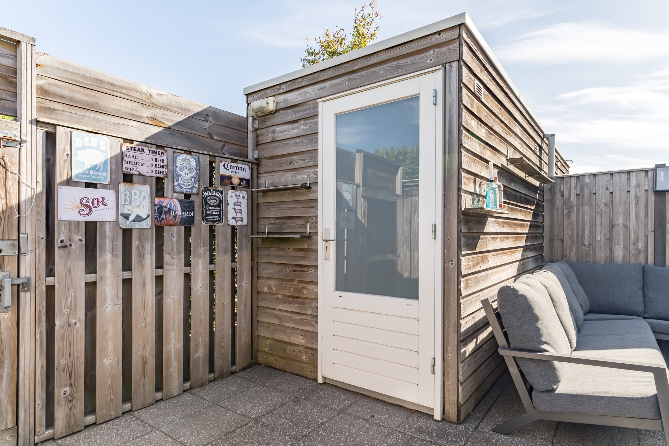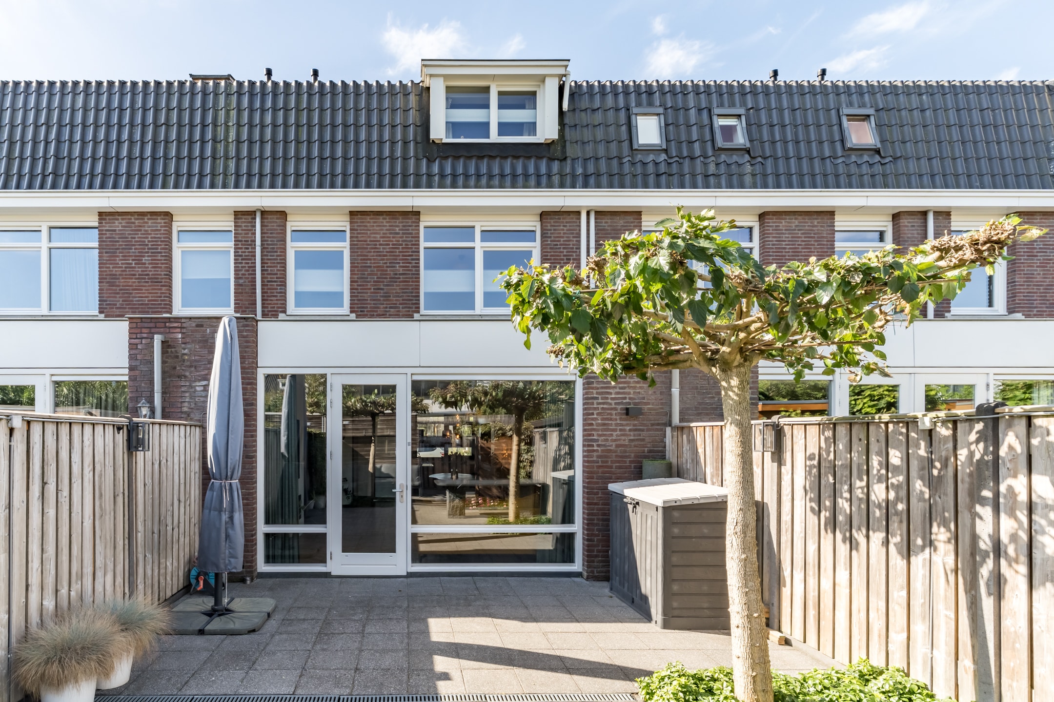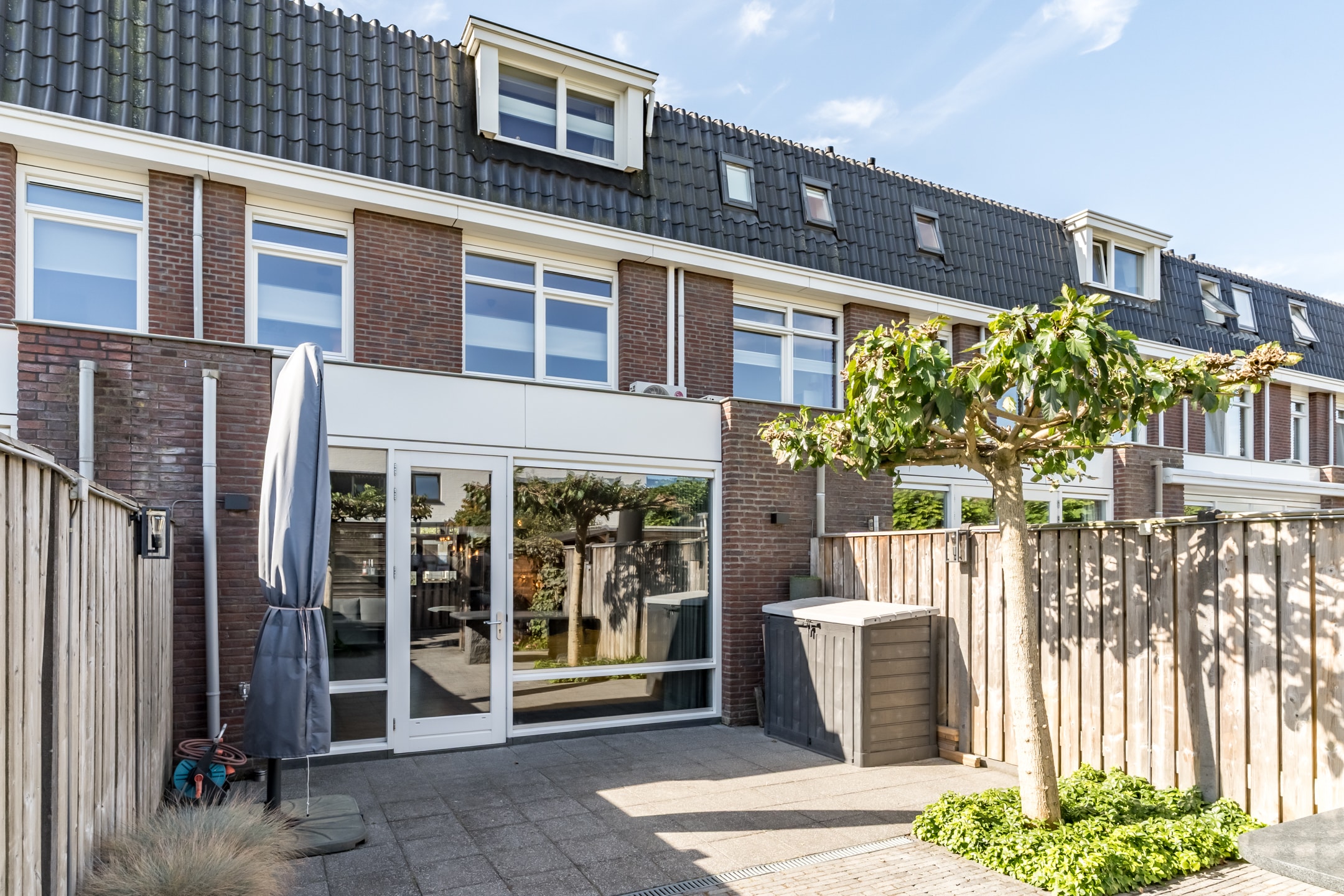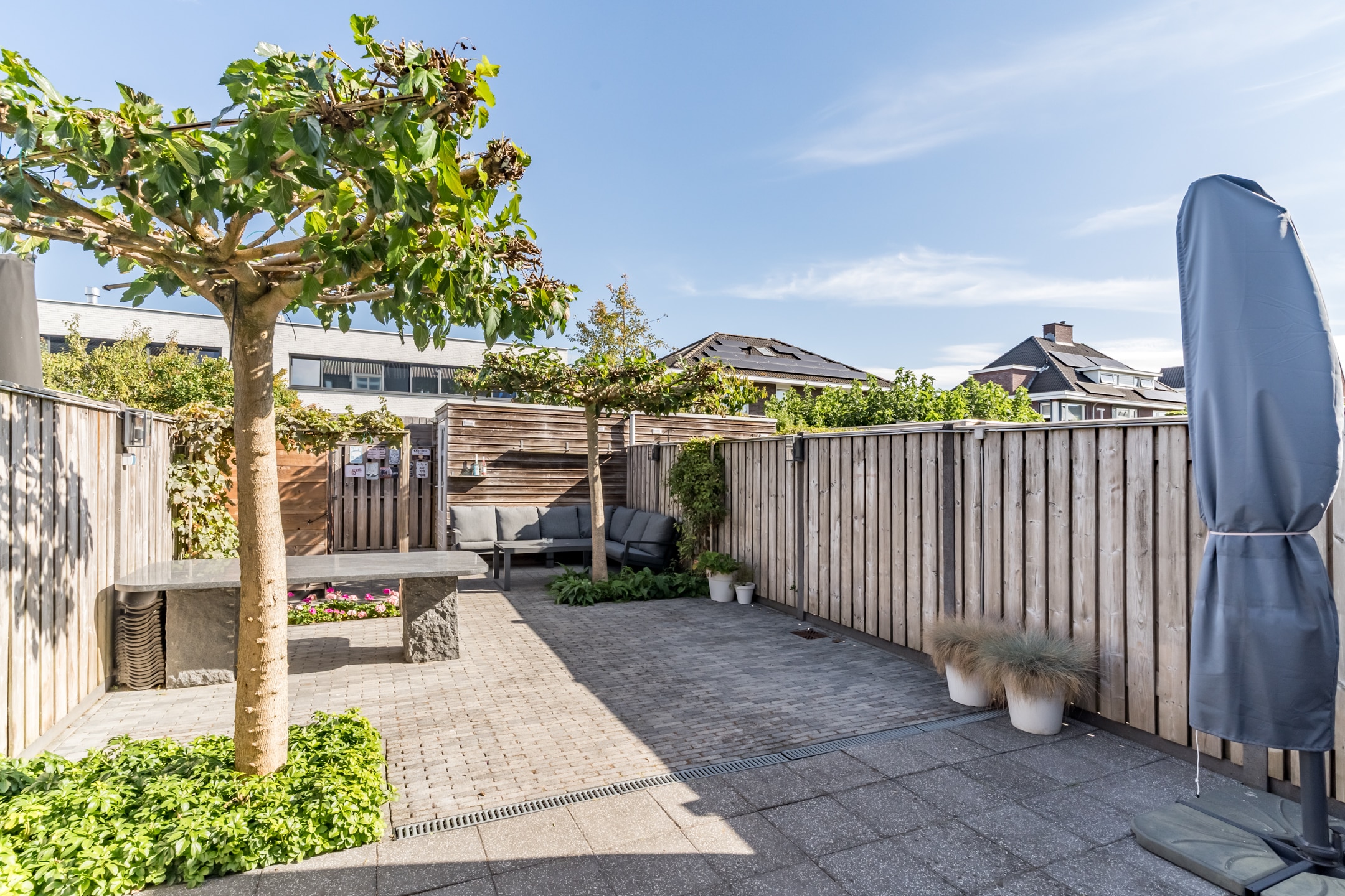 De zonnige, diepe achtertuin is een heerlijke plek voor jong en oud. Er is ruimte genoeg voor een loungeset en een grote eettafel en eventuele speeltoestellen. Helemaal achterin bevindt zich een houten berging met elektra en een achterom.