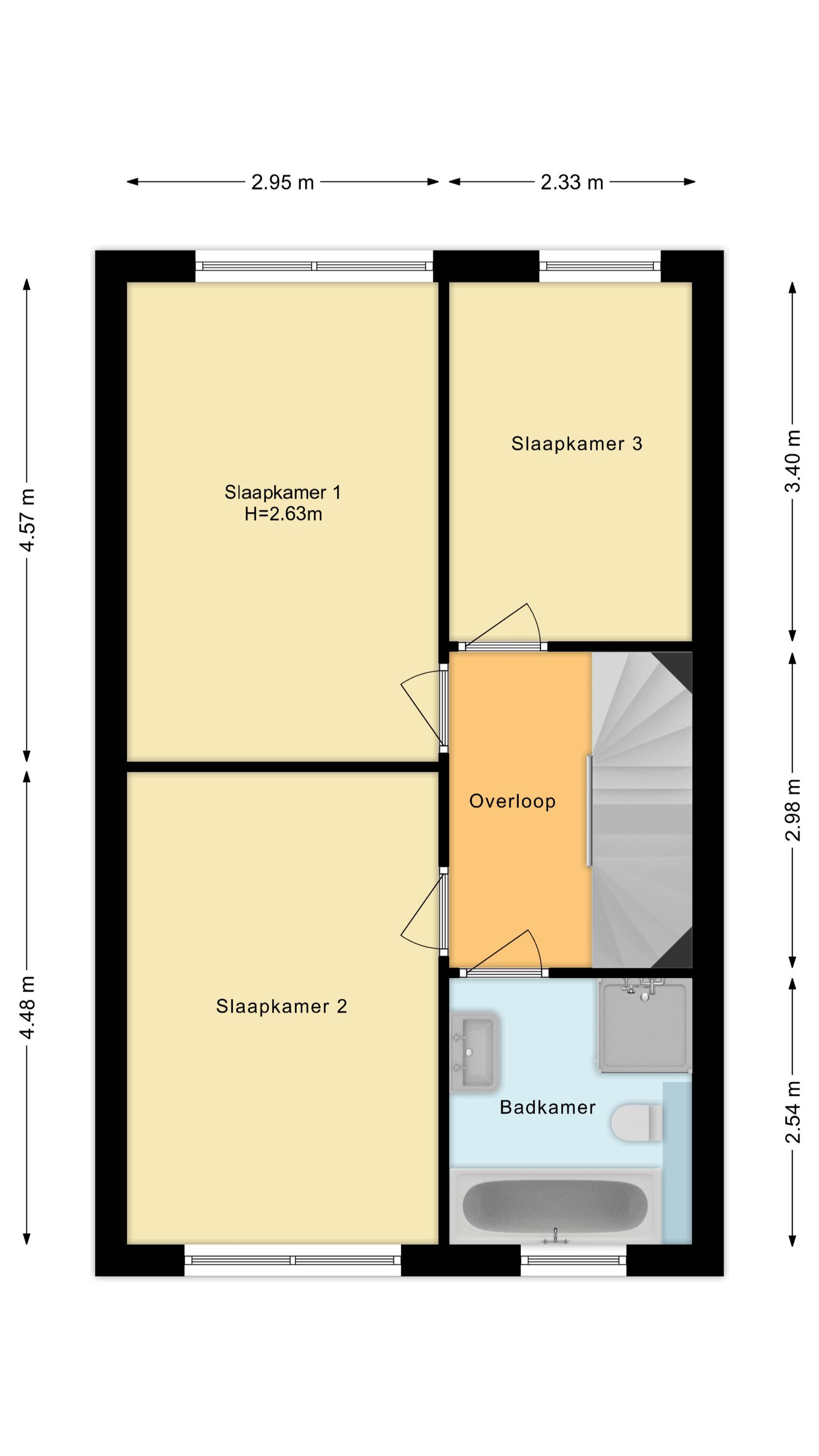 Op de eerste verdieping bevinden zich drie slaapkamers, een ruime overloop en de badkamer.