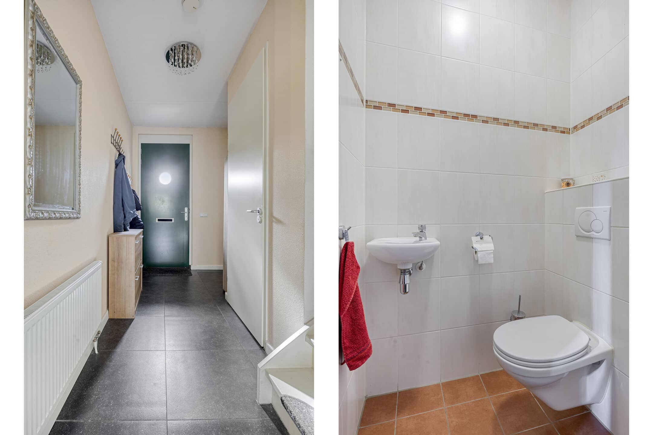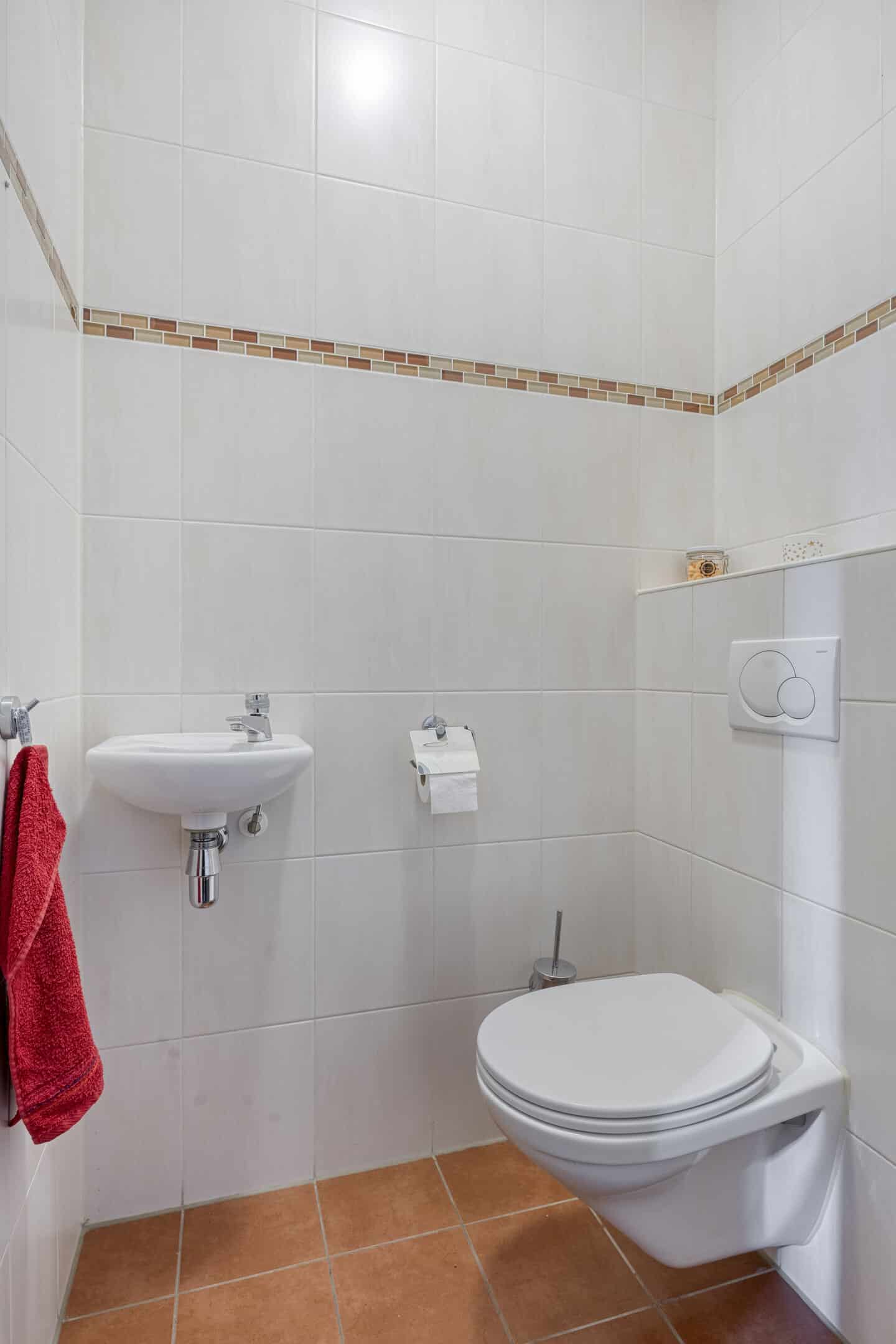 Ook de toiletruimte, met een wandcloset en een fonteintje, is vanuit de hal te bereiken.