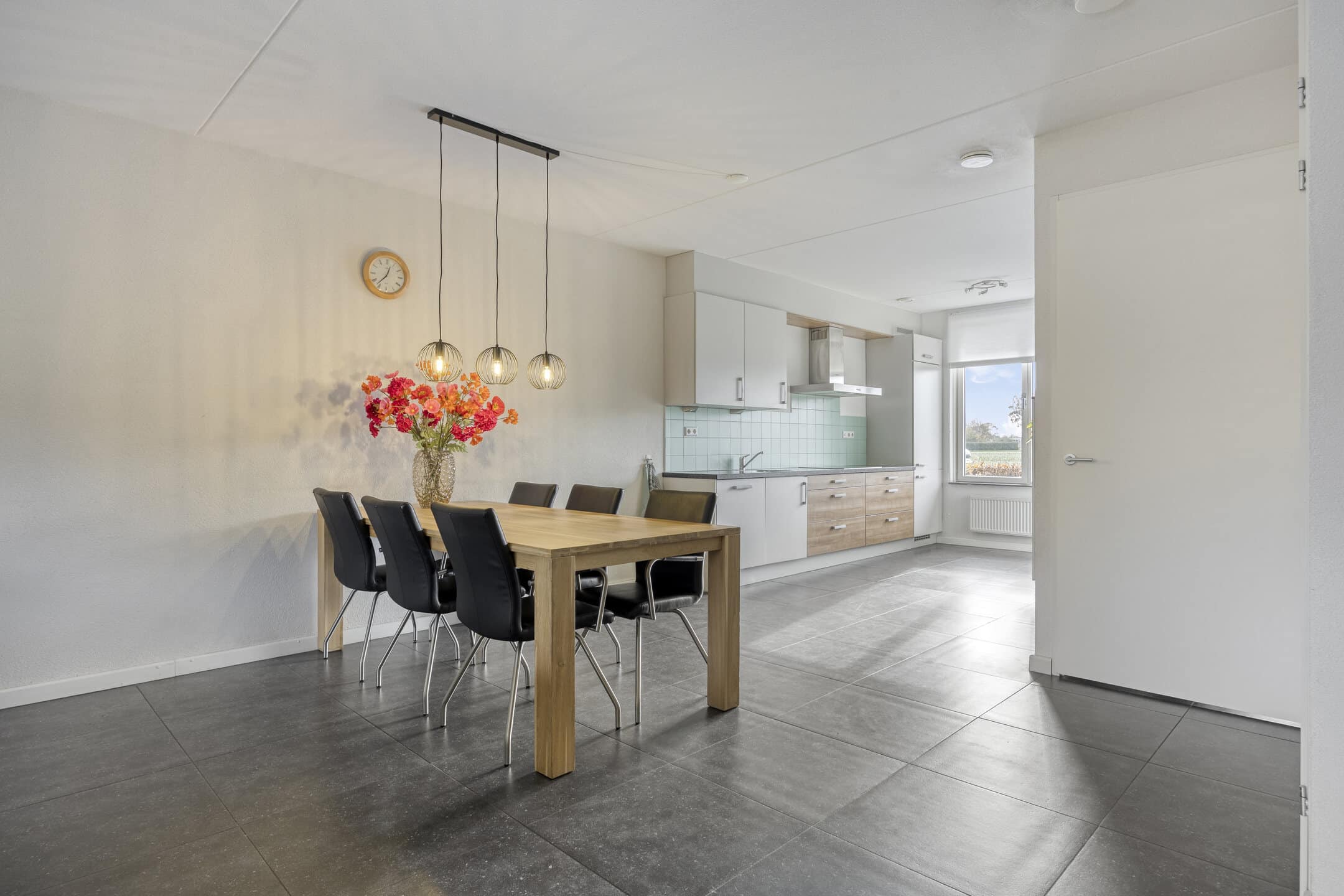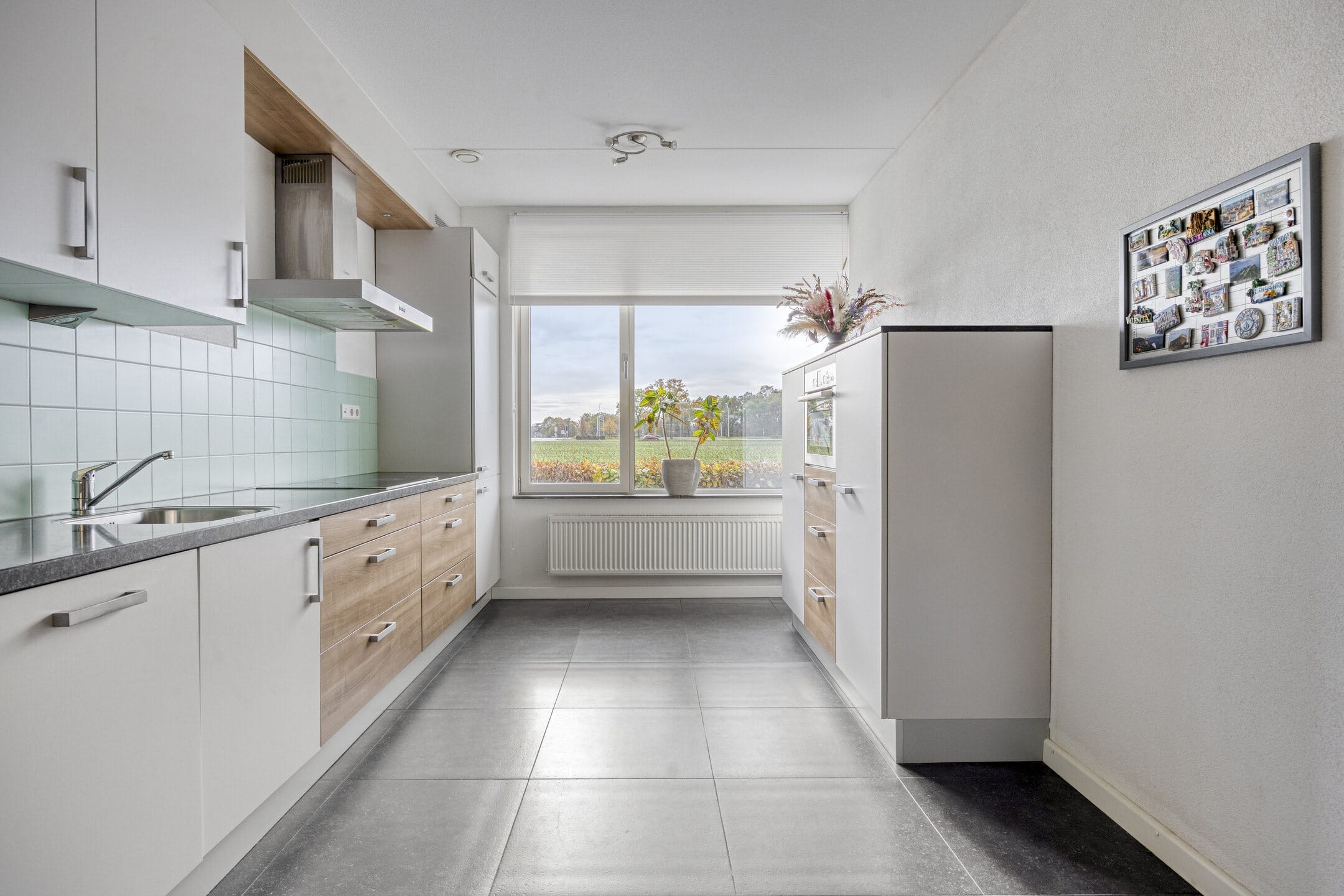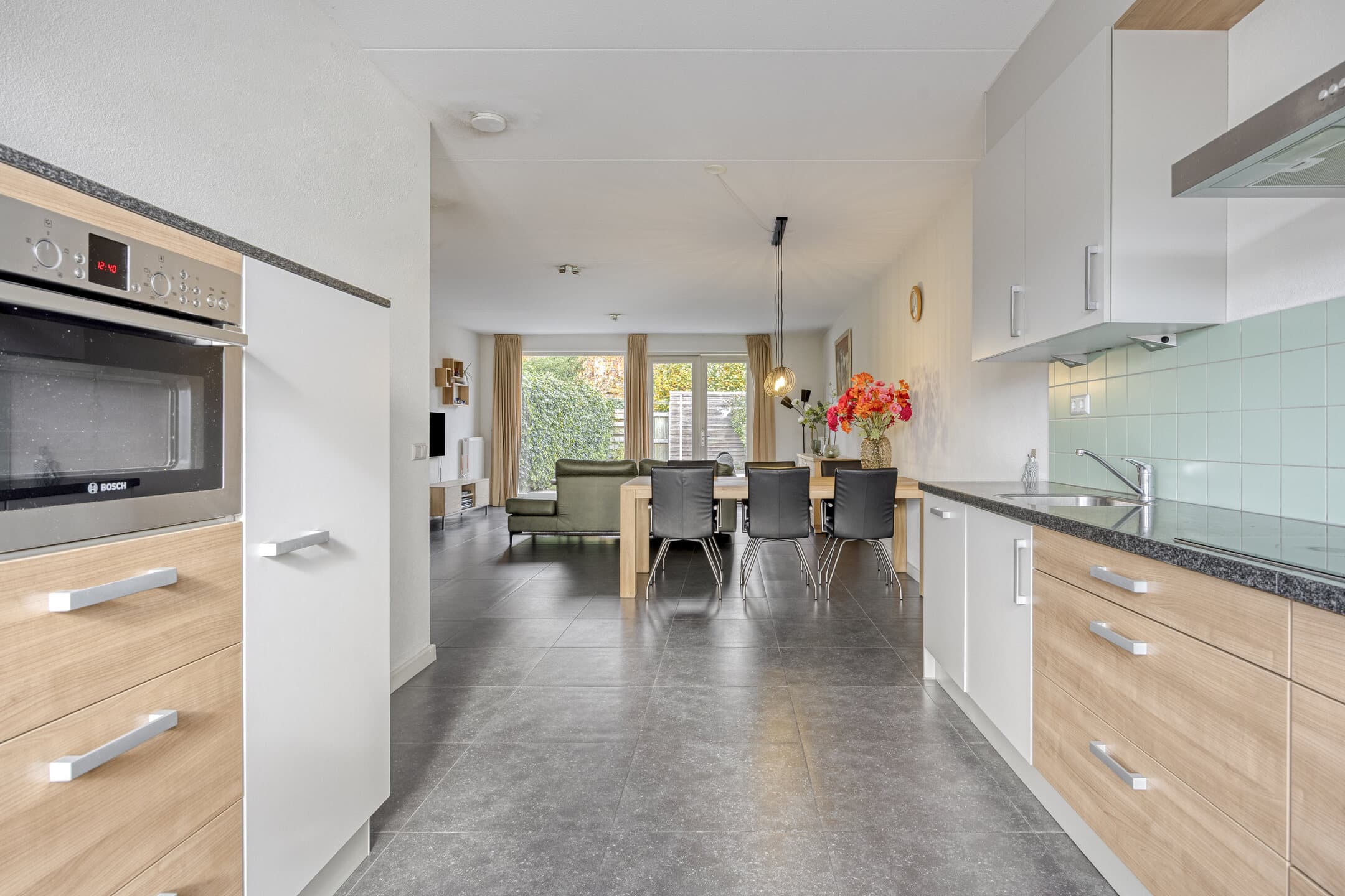 Aan de voorzijde is de open keuken, met uitzicht naar de rustige straat en het vele groen aan de overzijde.