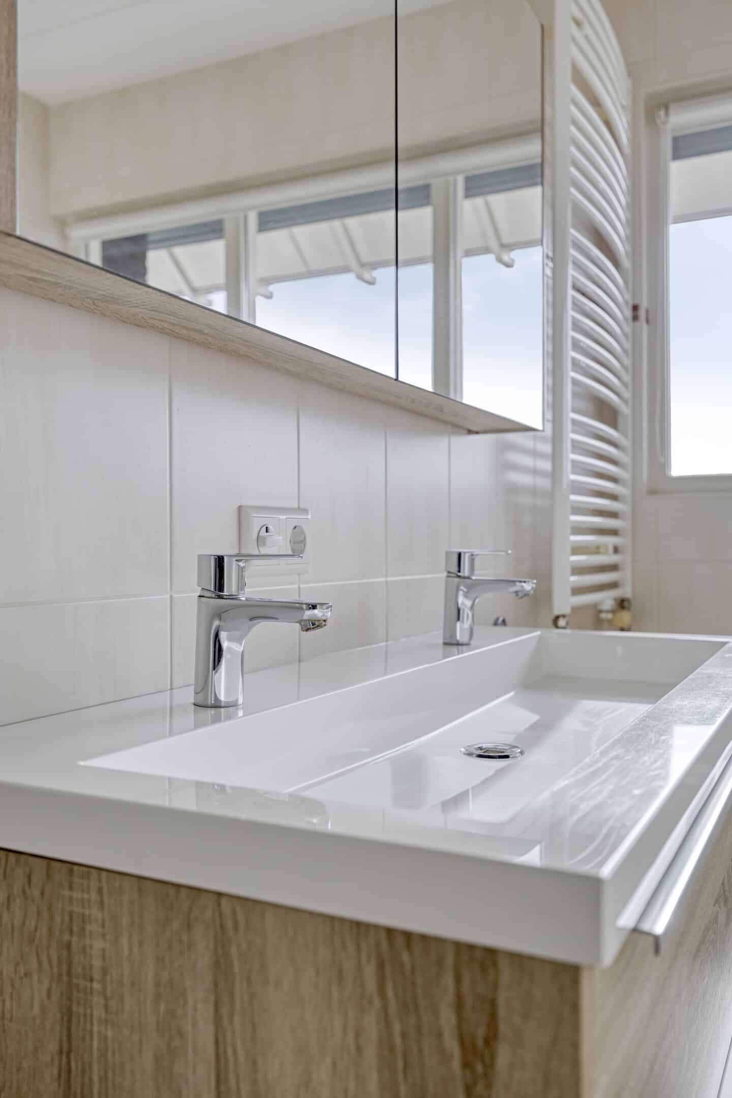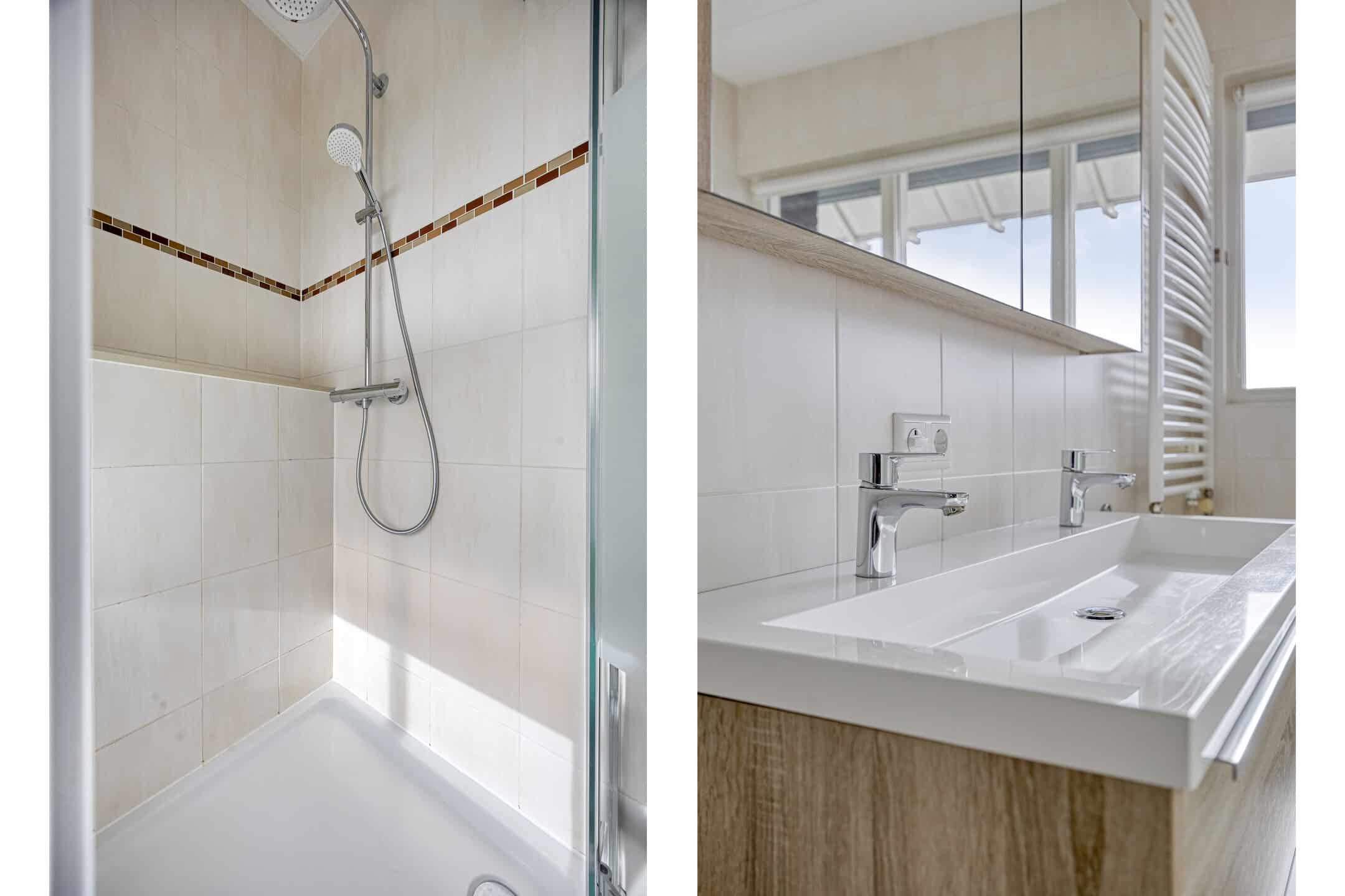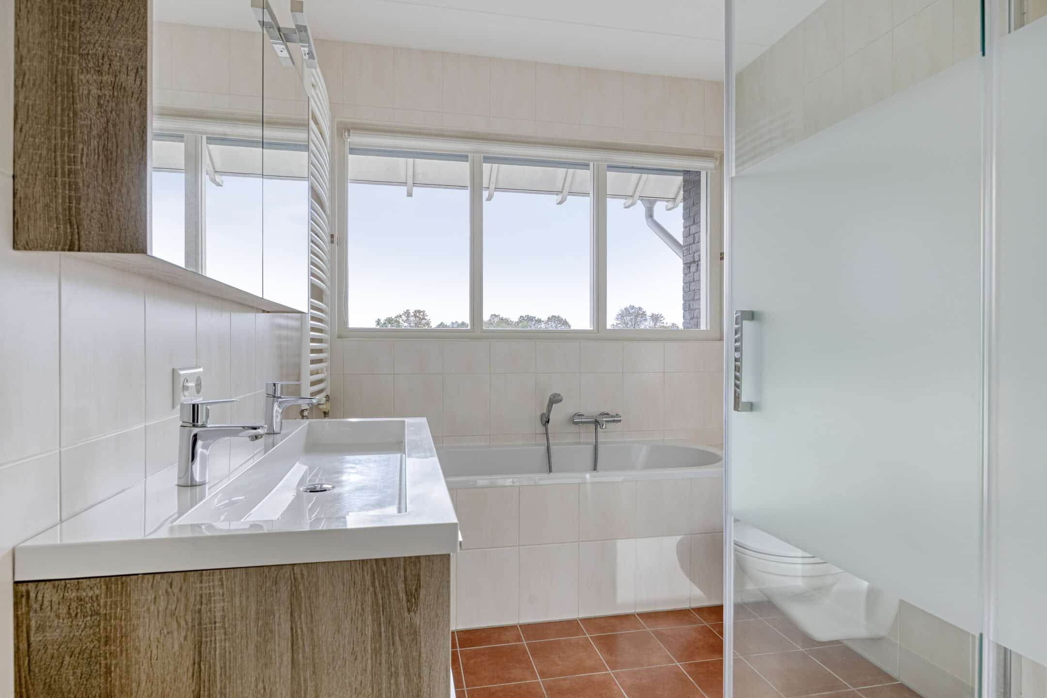 Aan de voorzijde bevindt zich ook de ruime badkamer, met drie grote ramen in de voorgevel. Tijdens het douchen kijk je naar de hoge bomen aan de overzijde van de straat. De rest van de comfortabele badkamer is ingedeeld met een fijn ligbad, tweede toilet, aparte douchehoek en een praktisch wastafelmeubel.