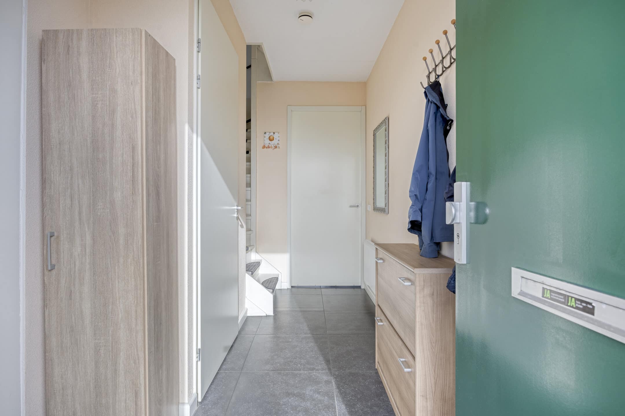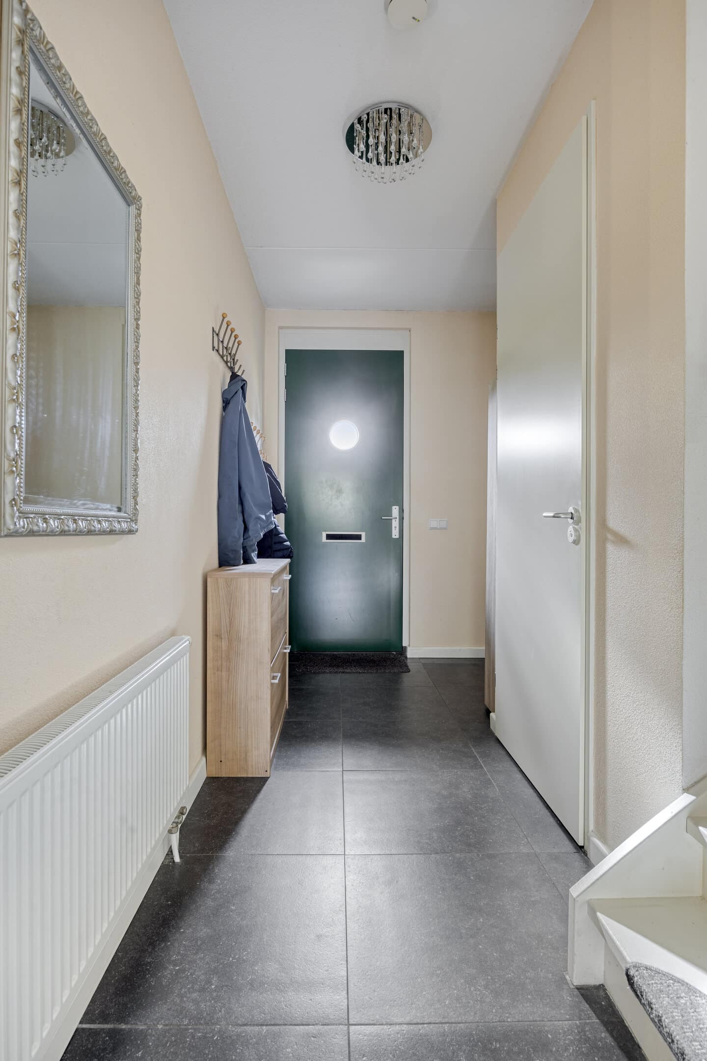 In de hal ligt een fraaie tegelvloer, die voor sfeer en luxe zorgt. In de hal zijn de meterkast, een kast met de verwarmingsunit en de trap naar de eerste verdieping gesitueerd.