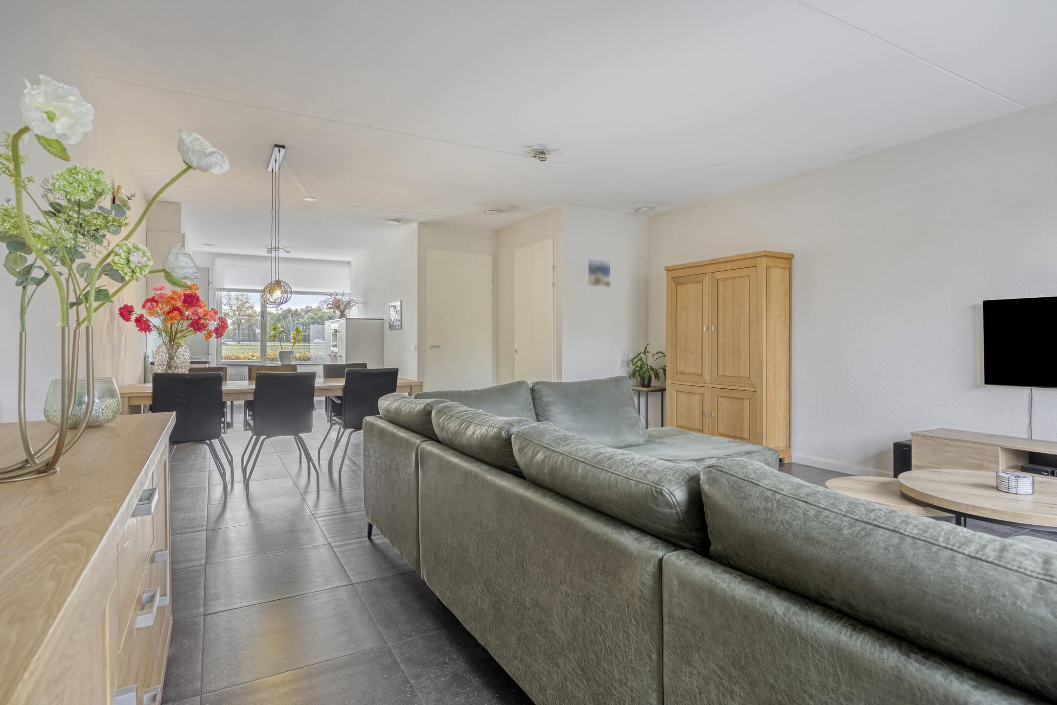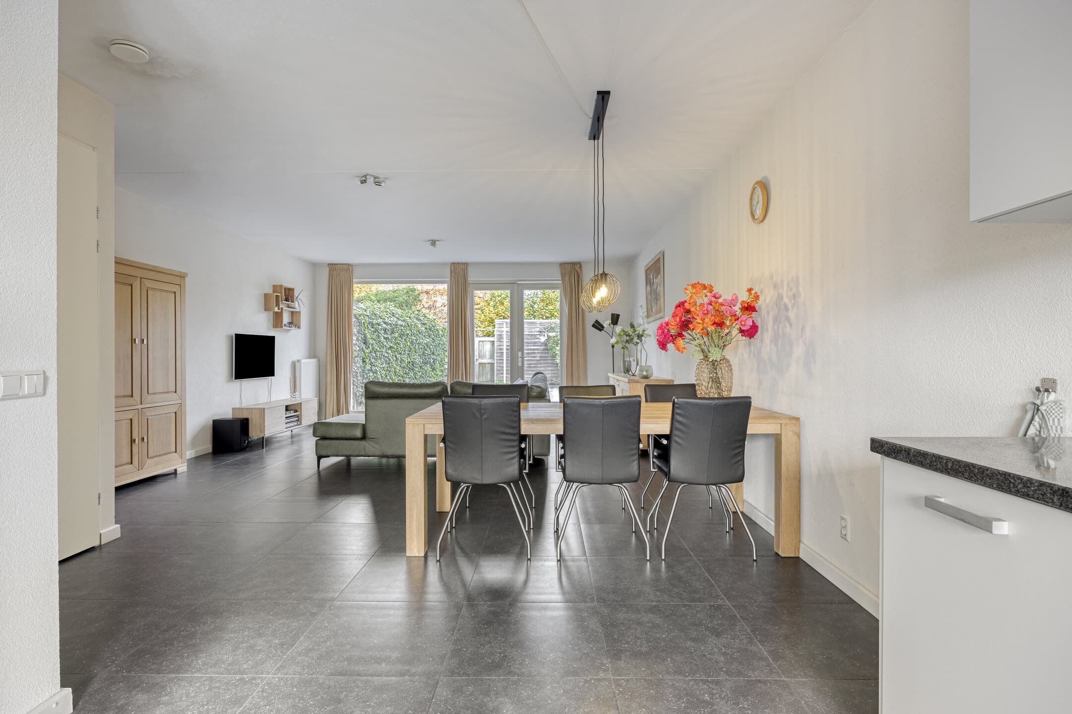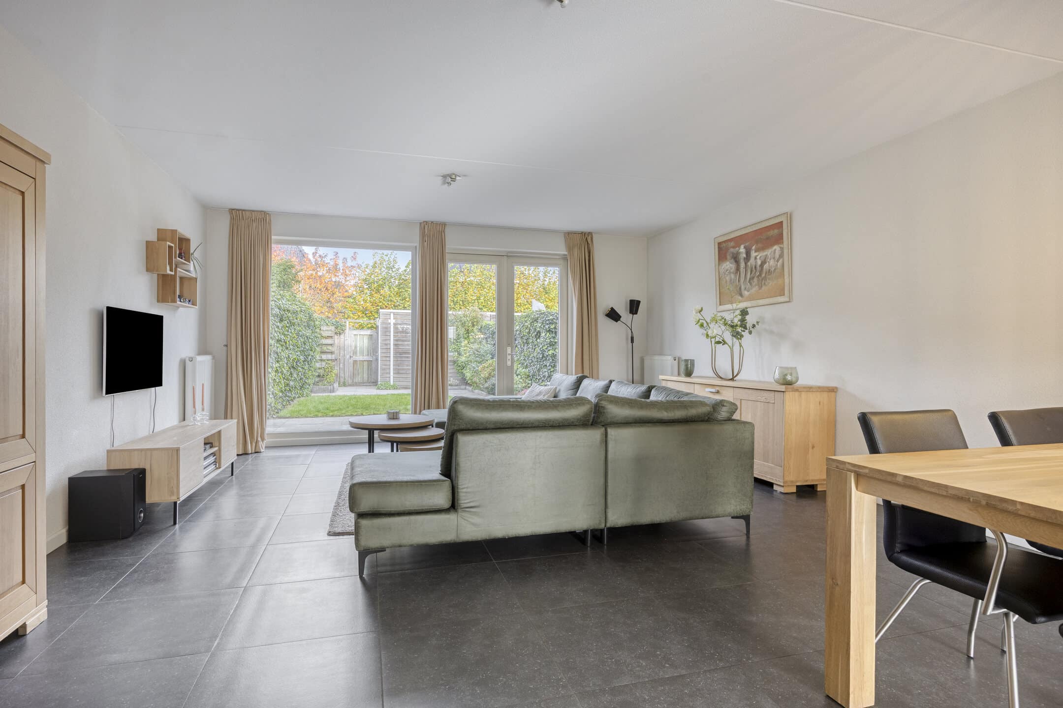 De tuingerichte woonkamer, met ramen tot vloerhoogte, is fijn in te delen met een zit- en een eetgedeelte.