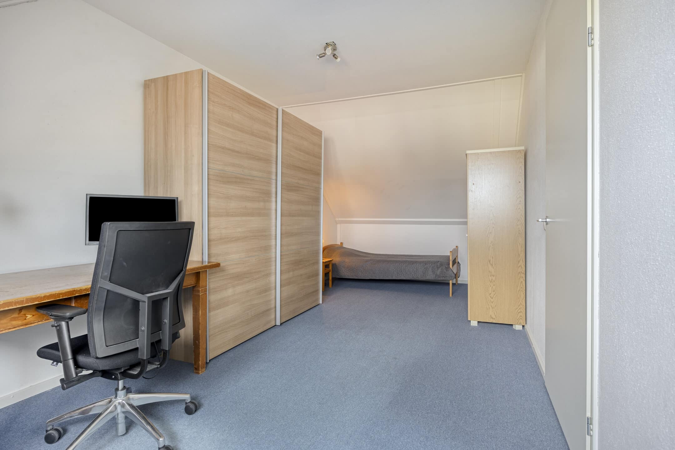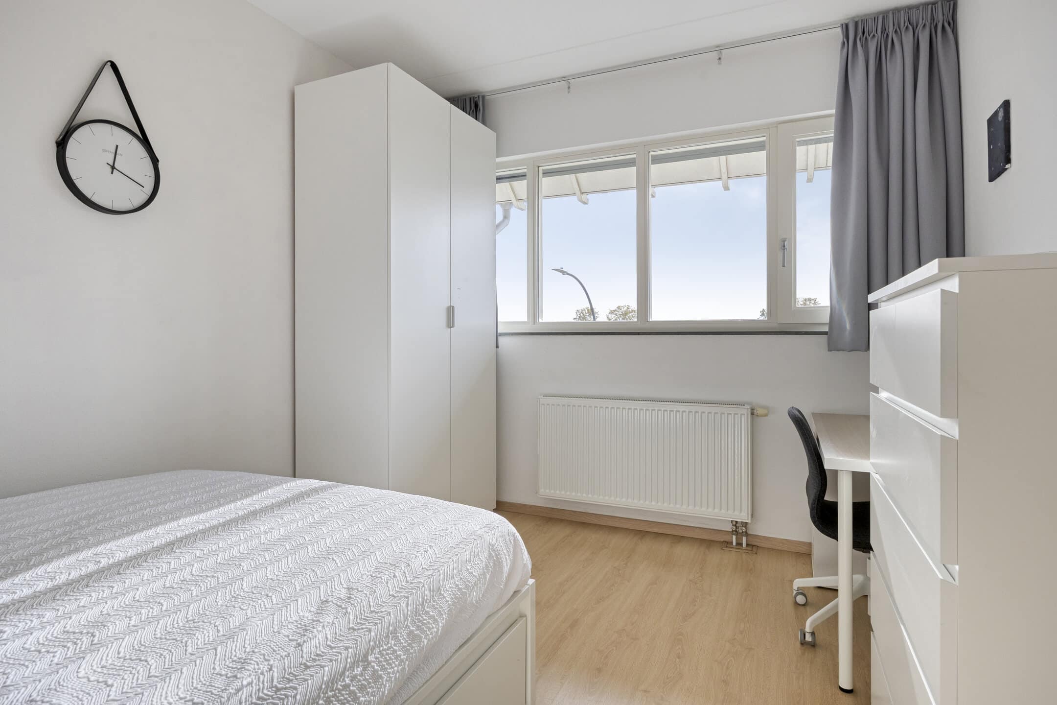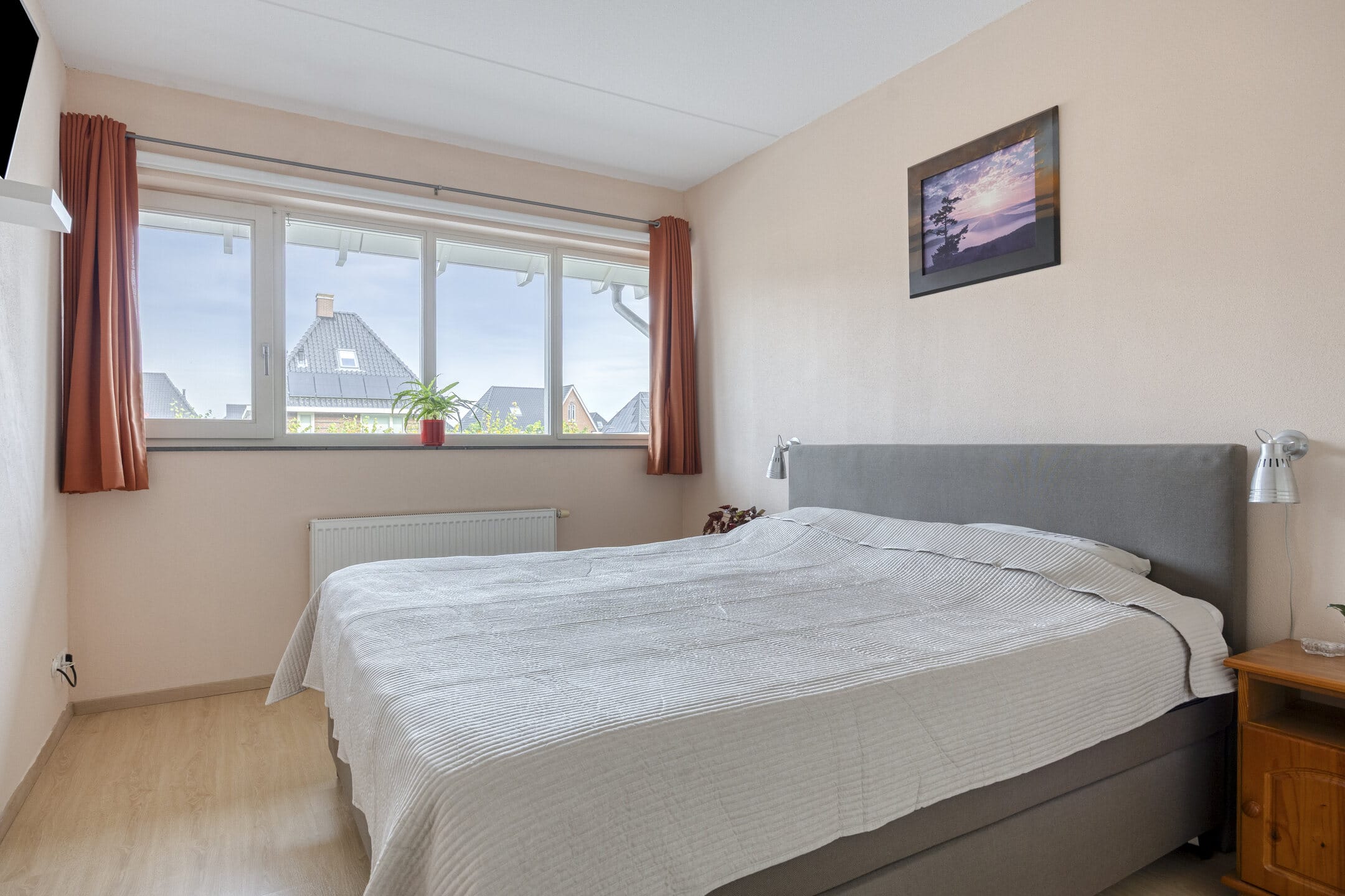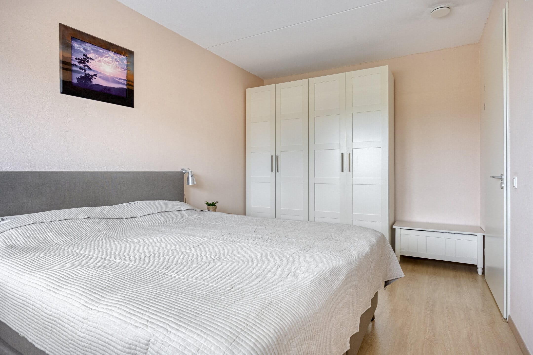 Deze slaapkamer biedt volop ruimte voor kledingkasten en een ruim tweepersoonsbed.