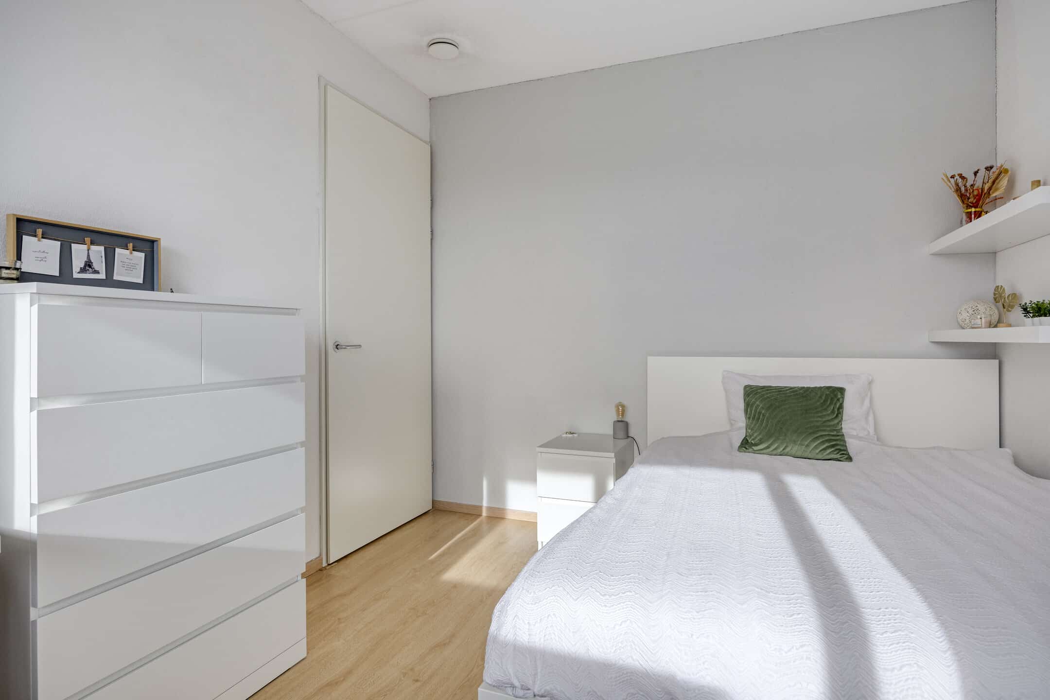 De lichte, neutrale kleurenstellingen van de slaapkamers geven een goede basis om de ruimtes naar eigen smaak in te richten en te stylen.