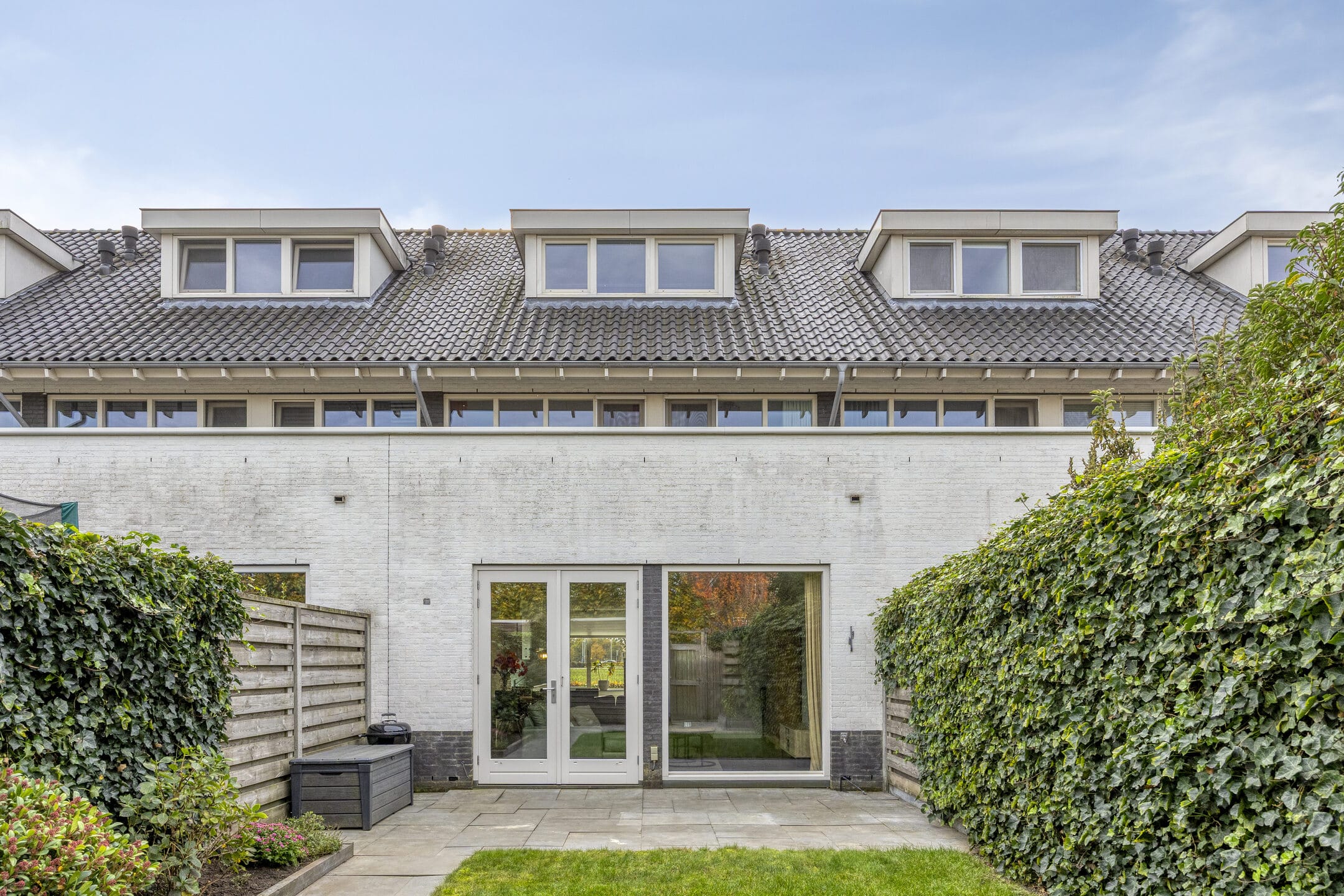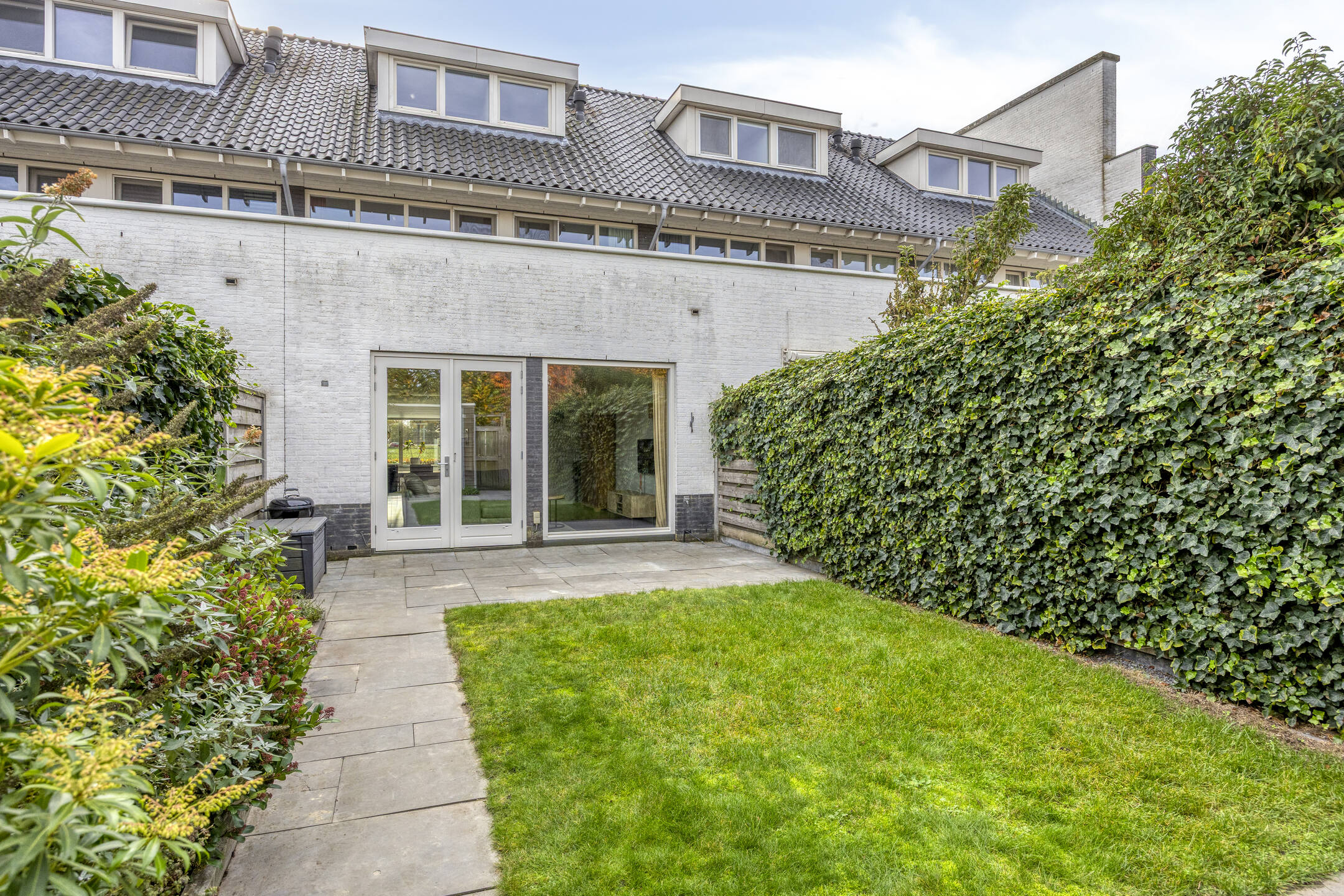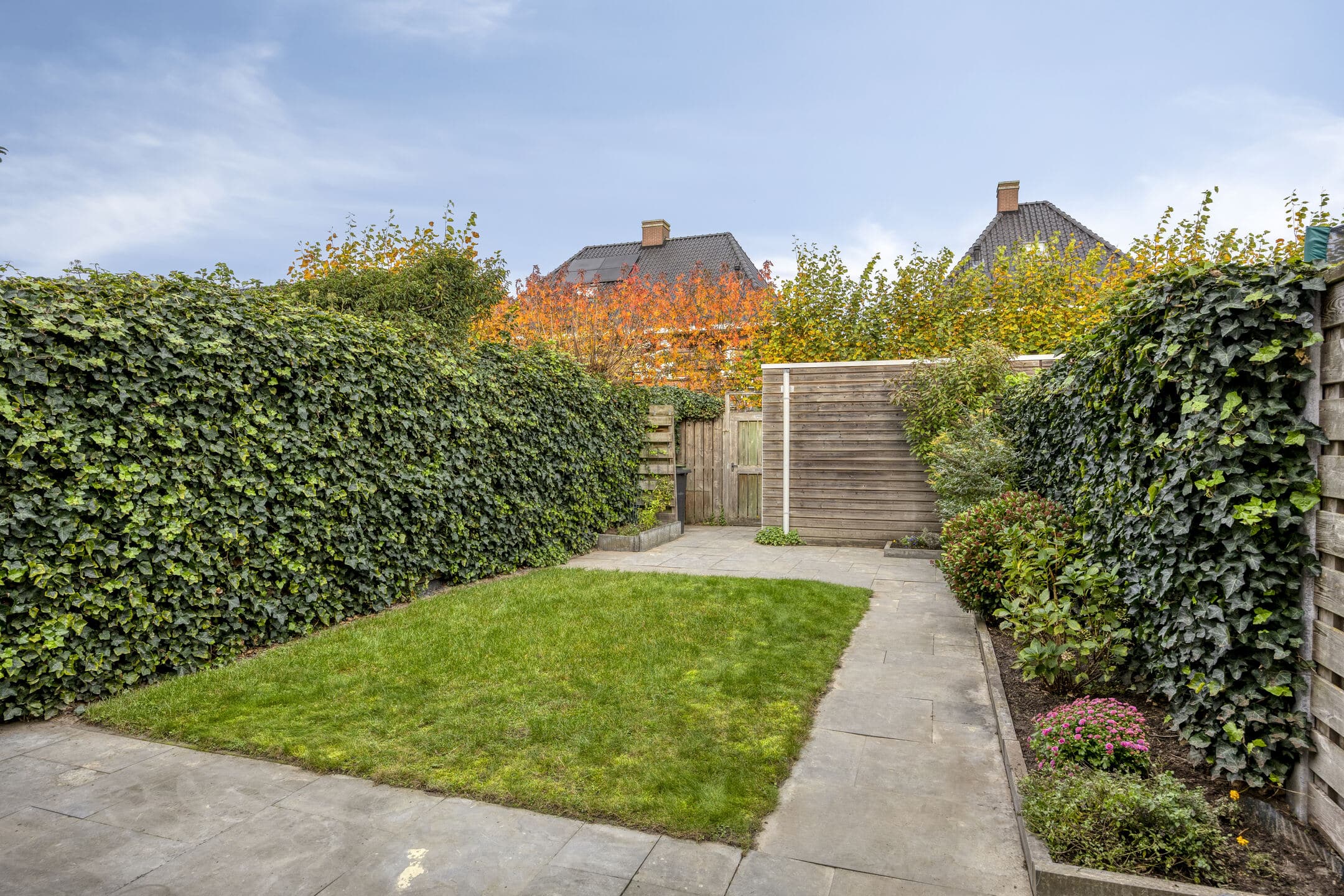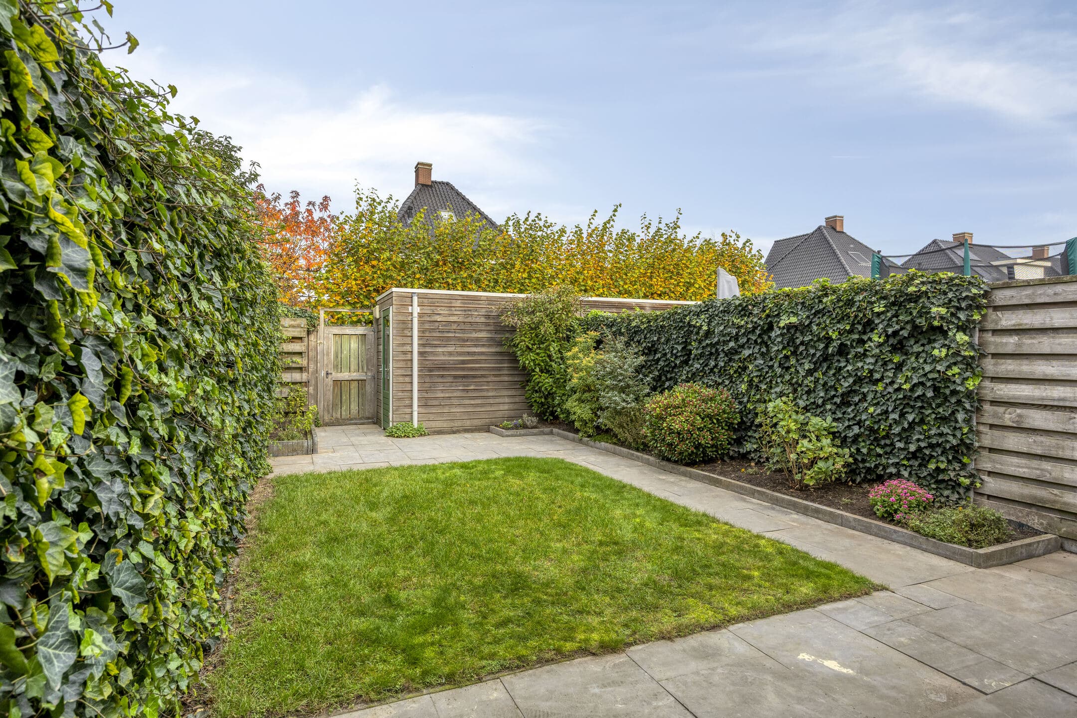 In de voortuin staat, net als bij de buren, een lage beukenhaag die weinig onderhoud nodig heeft. De grotendeels betegelde achtertuin is aangelegd met grote betontegels, gras en houten schuttingen. Achterin de tuin bevinden zich de (fietsen)berging en een extra brede poort (120 cm) naar de steeg.